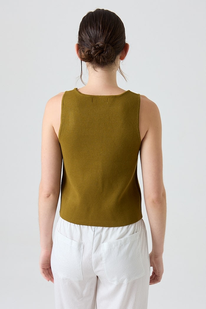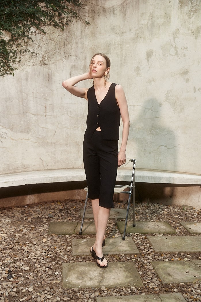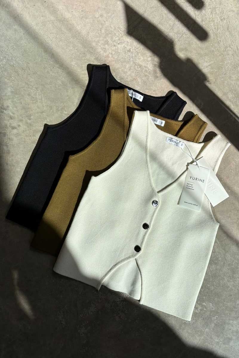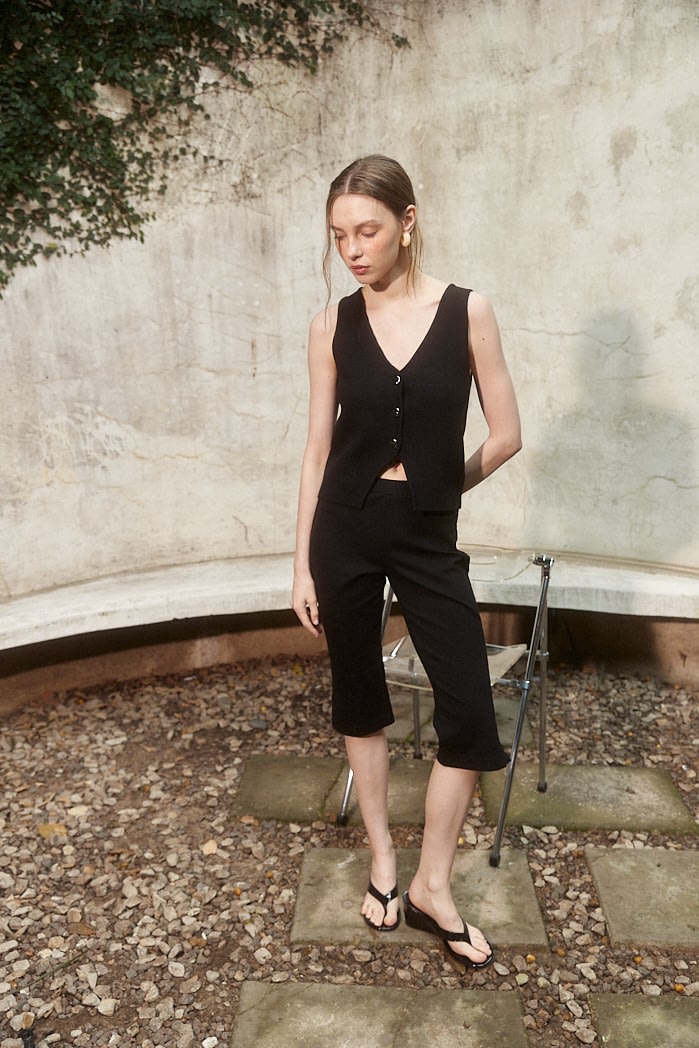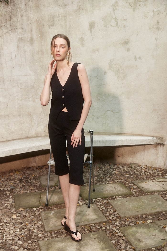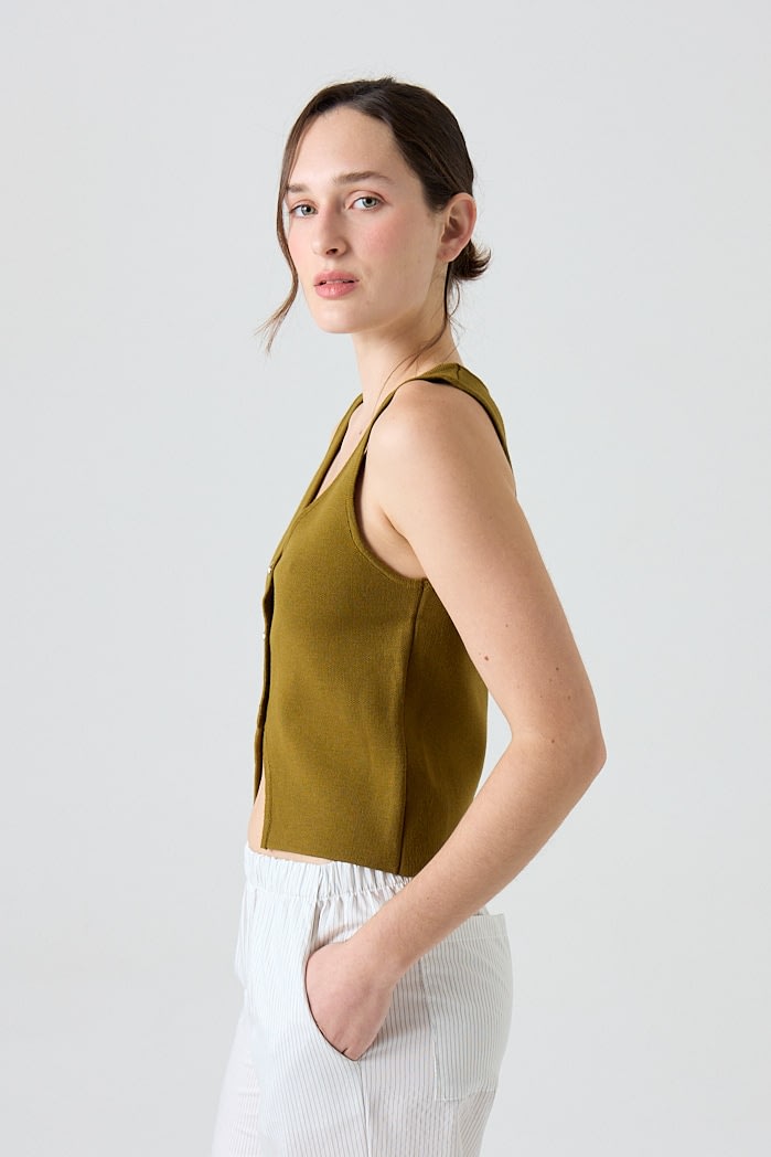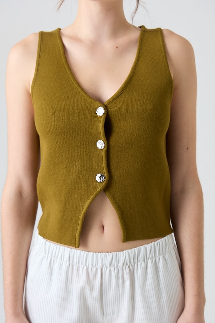 Chaleco tejido con escote en V y botones metálicos decorativos al frente. Diseño corto y moderno. Composición: 72% Viscosa 28% Poliéster