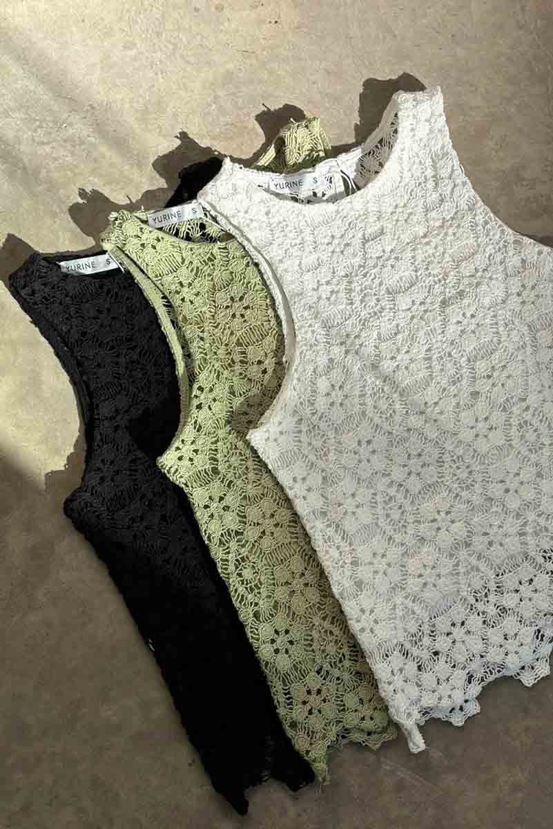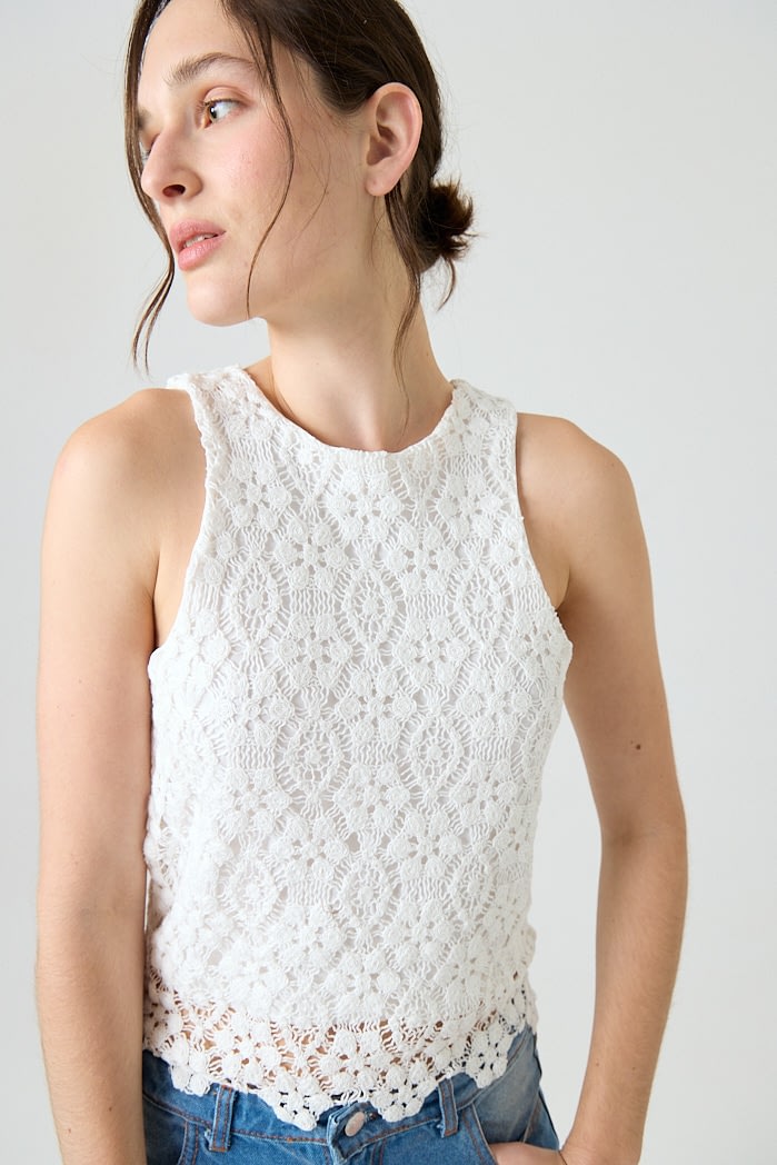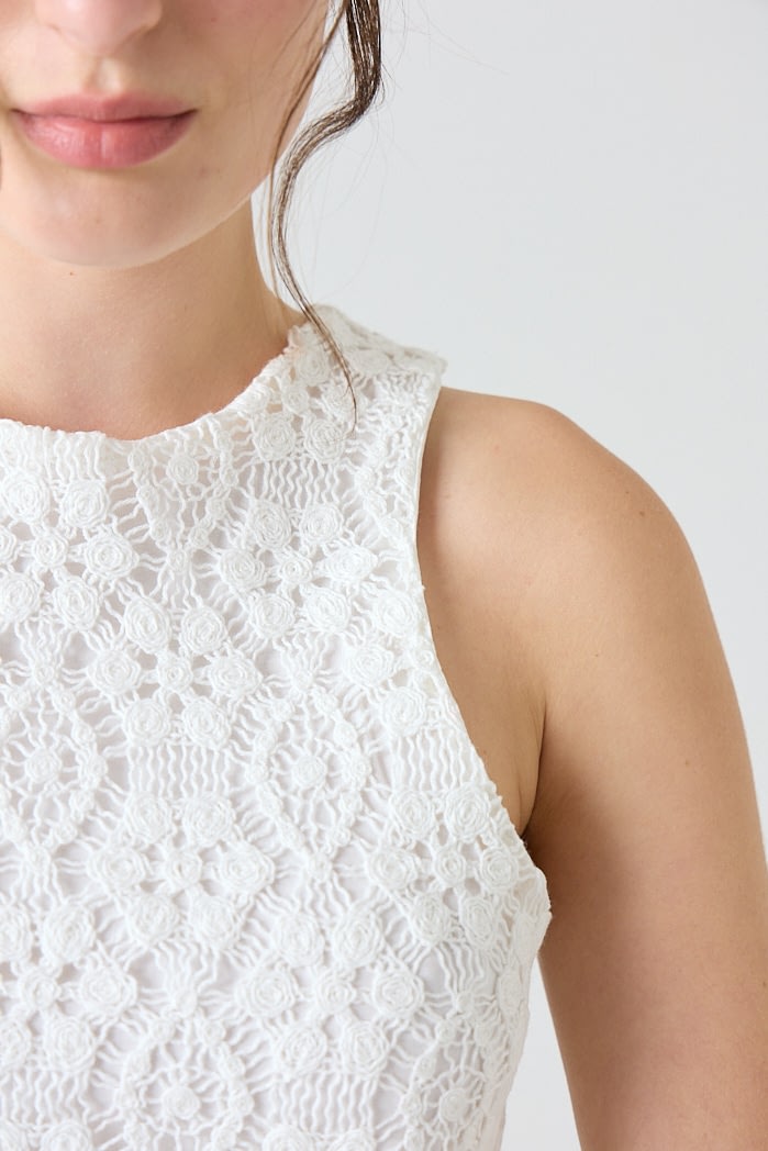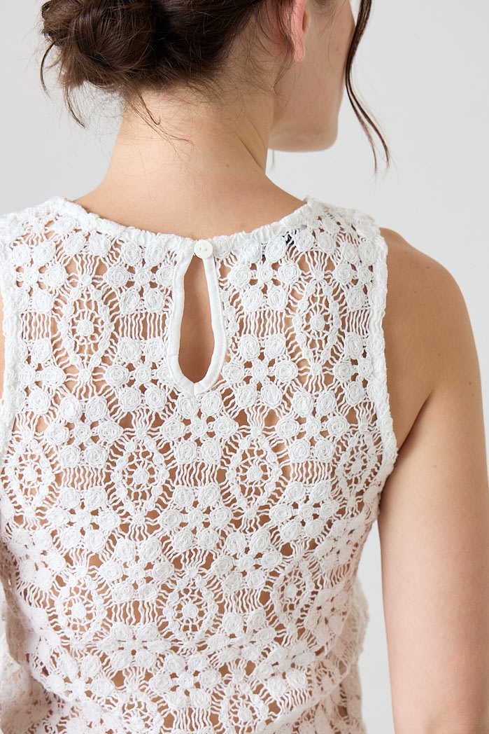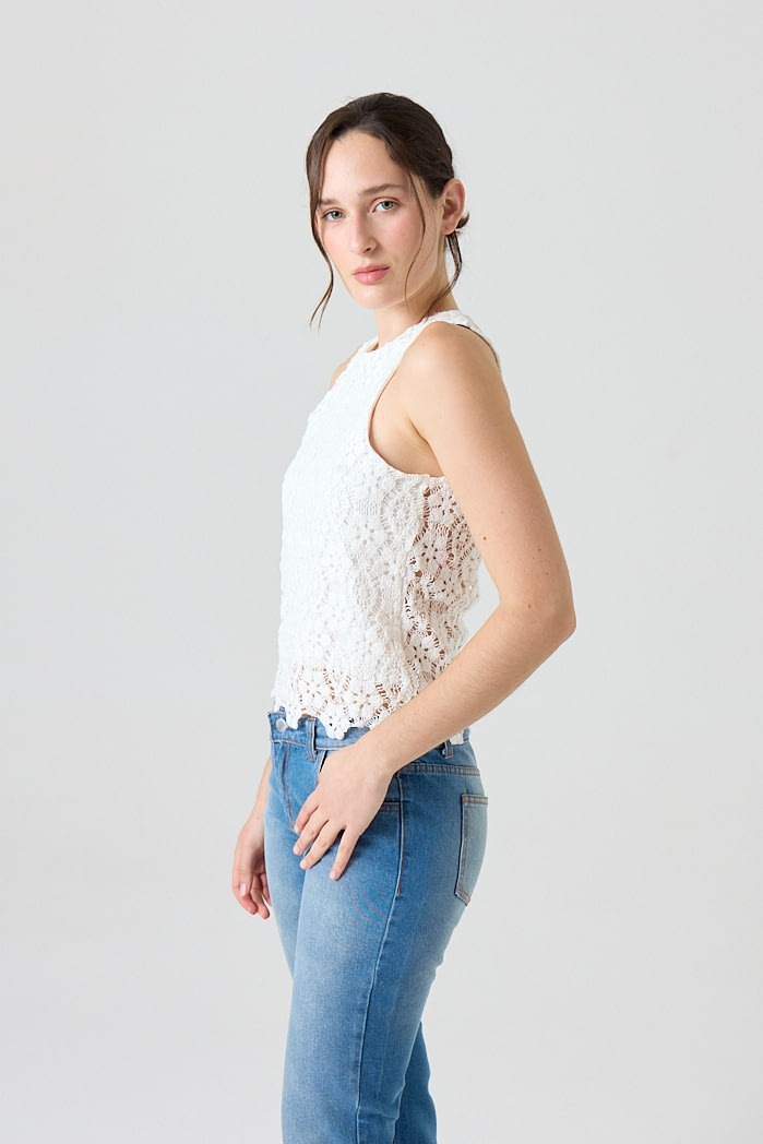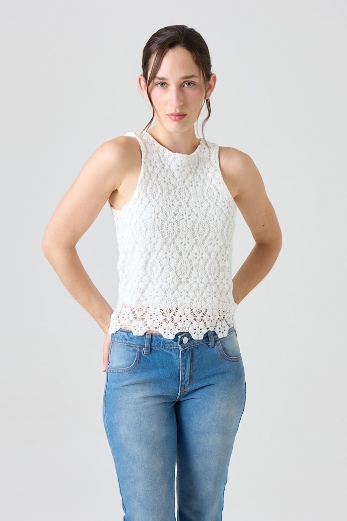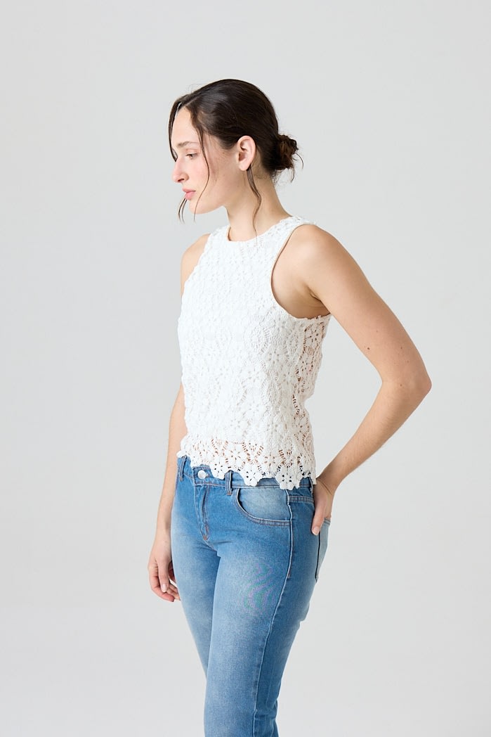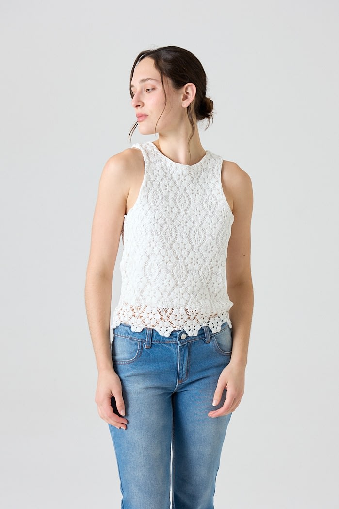 Musculosa de encaje con diseño floral calado. Presenta cuello redondo con terminación ondulada en el ruedo y espalda con pequeño ojal y botón. Composición: 100% algodón.