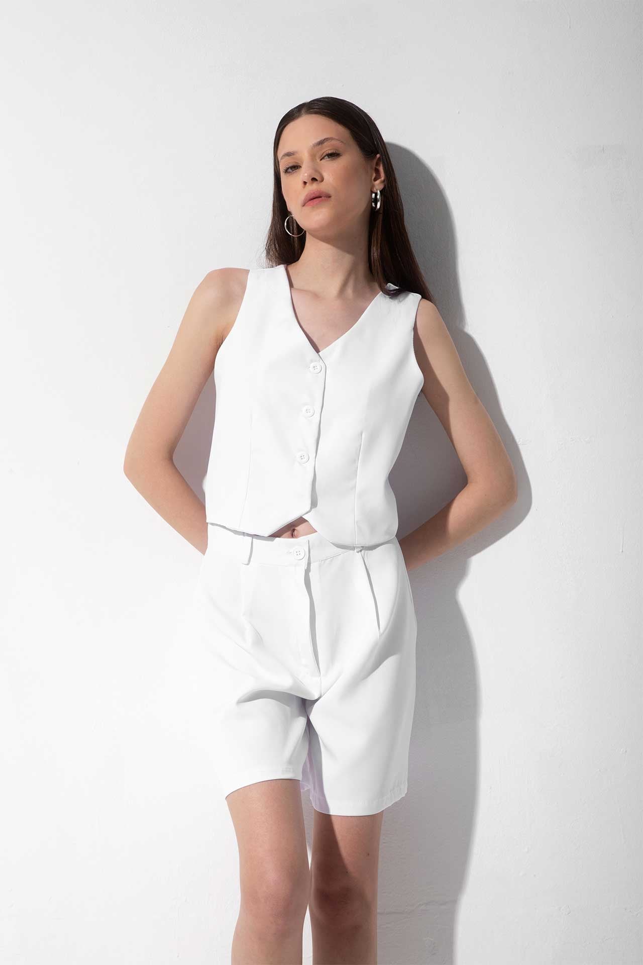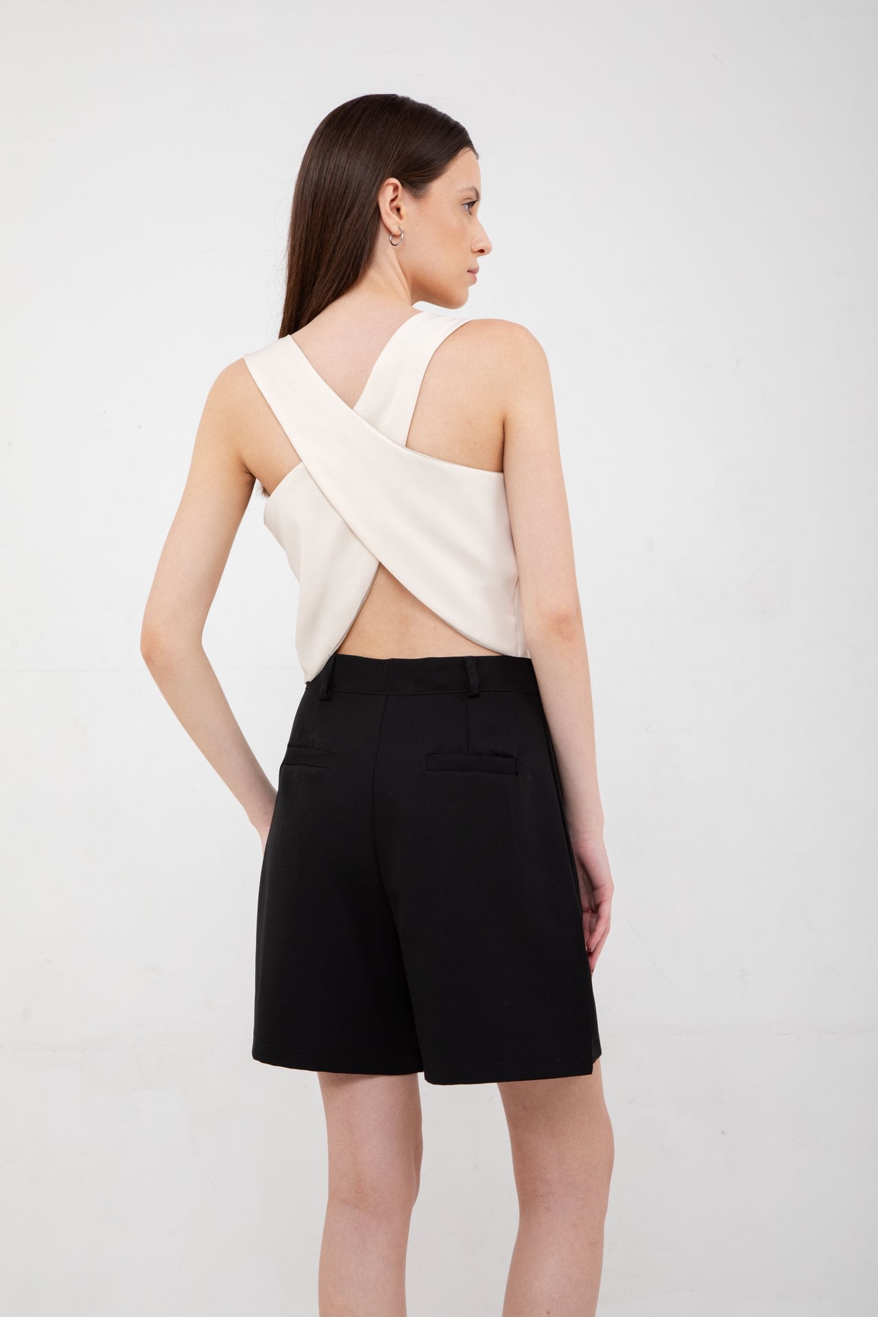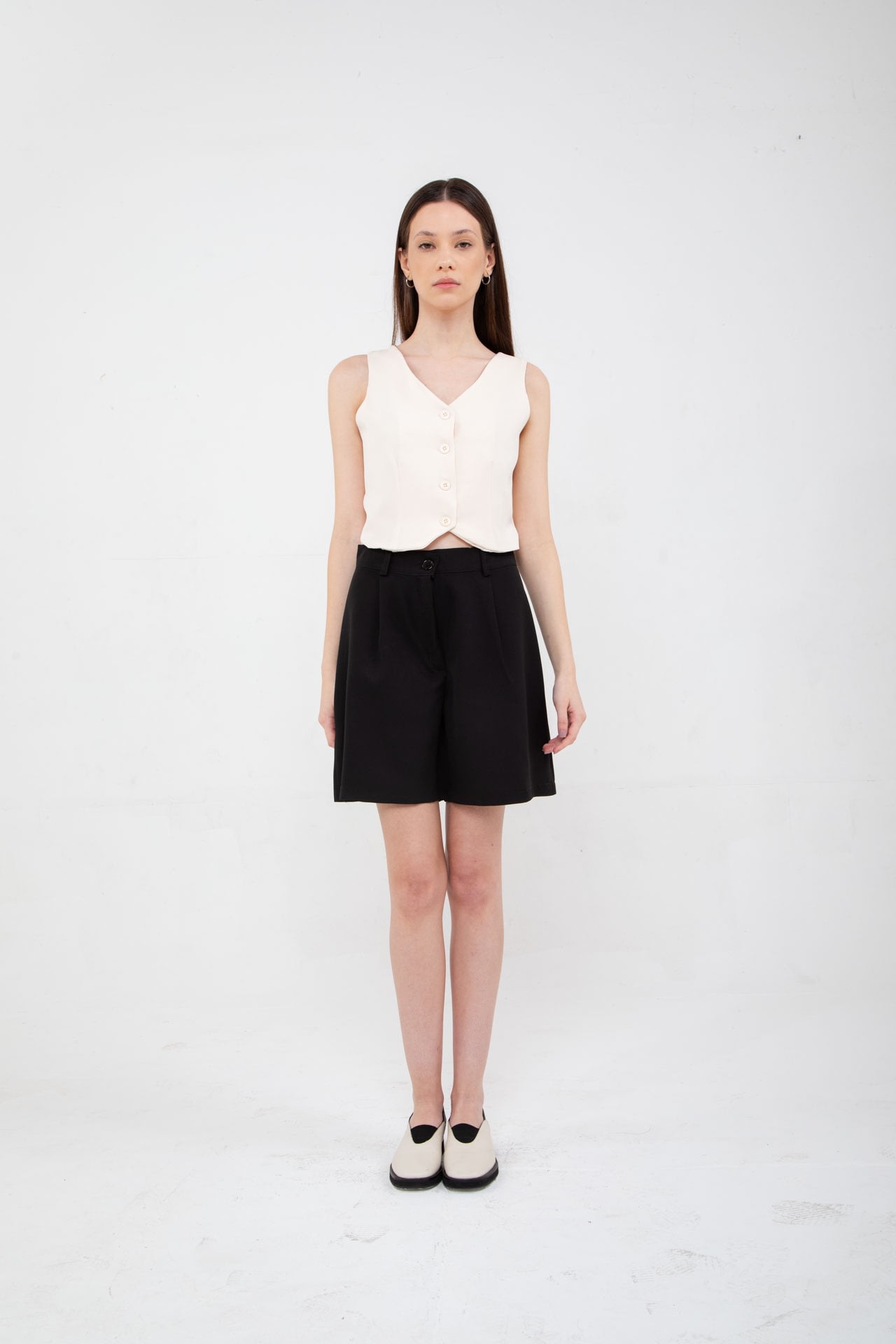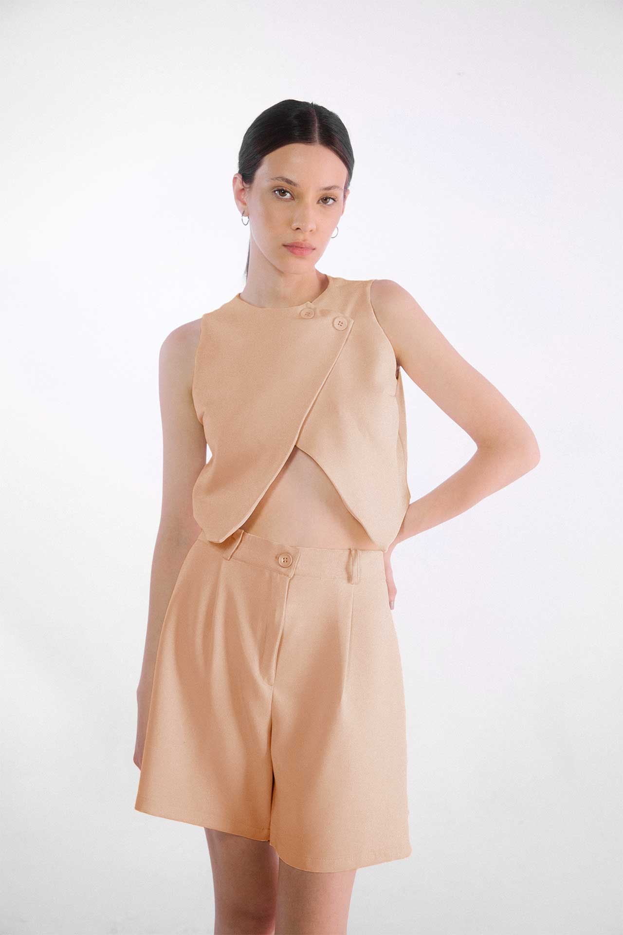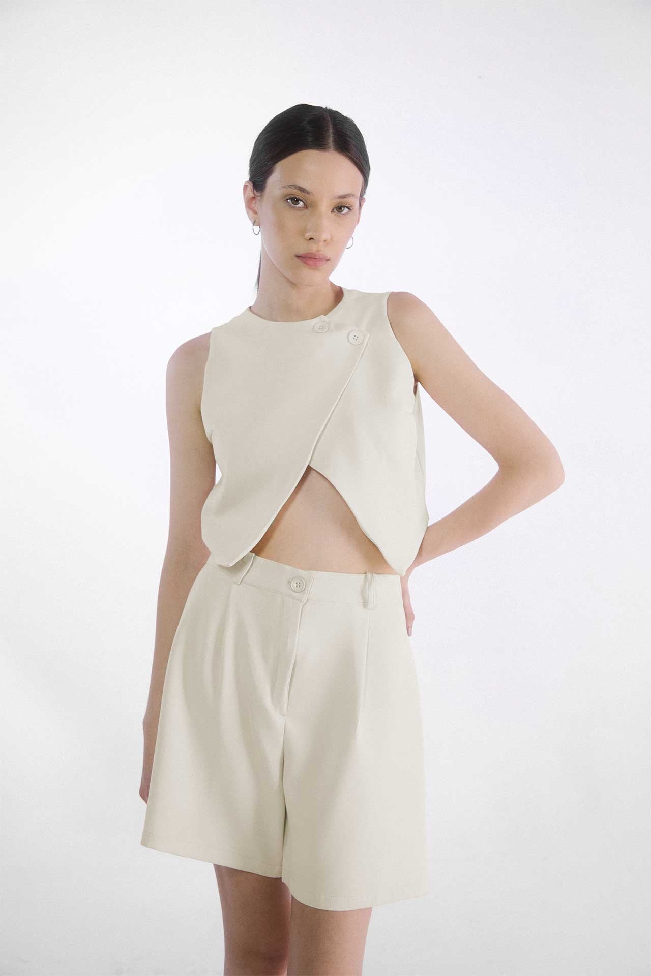 Bermuda de crepe sastrero sin bolsillos laterales, bolsillos falsos traseros, con boton al tono.