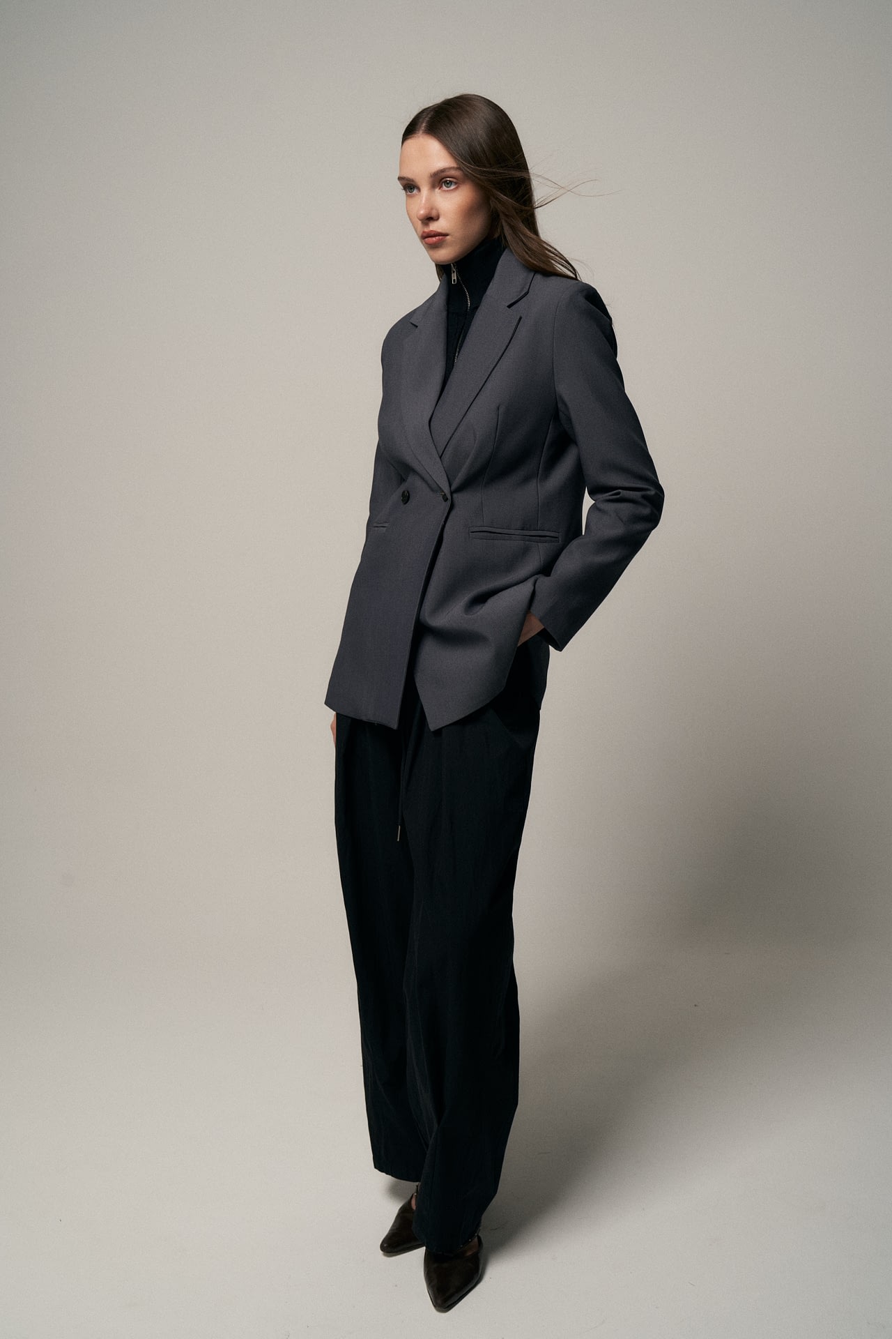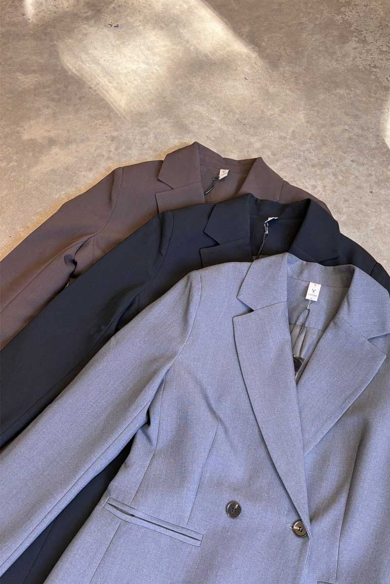Blazer sastrero premium (79% poliester 16% rayon 5% elastano) con dos botones horizontales, forrado, con hombreras y bolsillos reales.