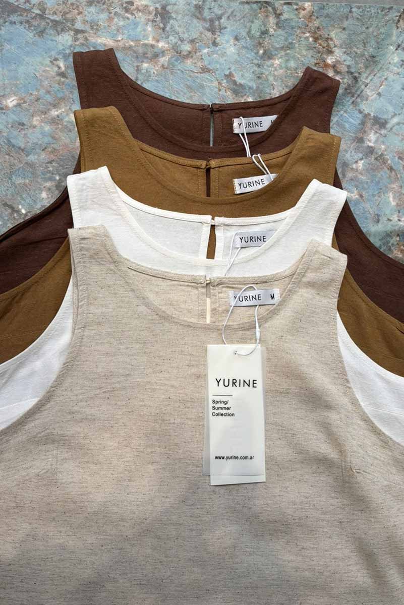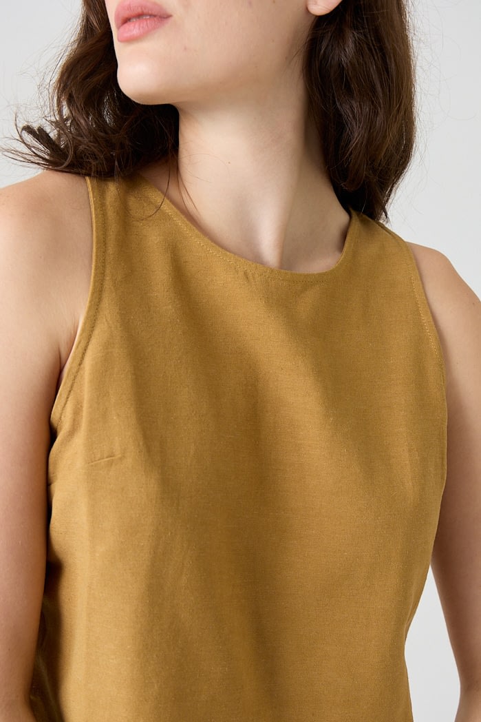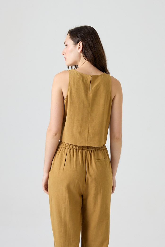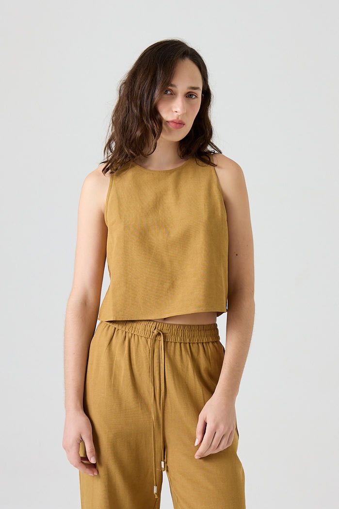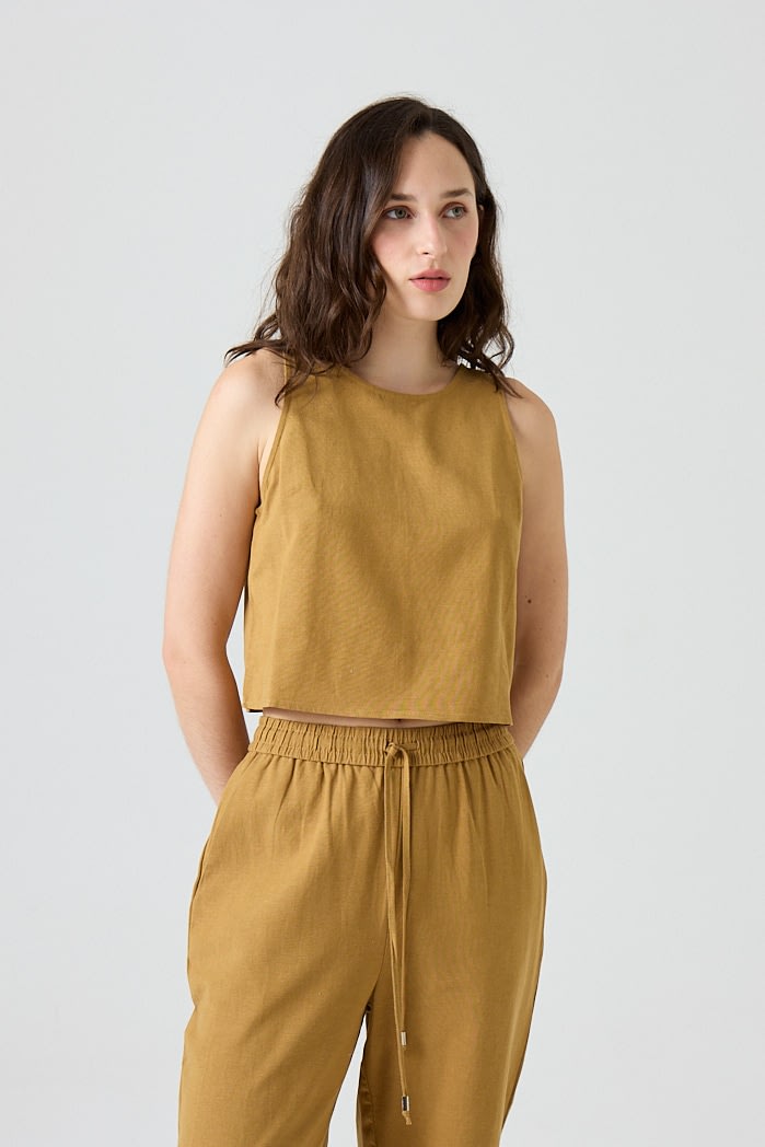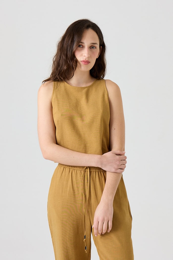 Top corto confeccionado en lino liviano, con escote redondo y espalda con abertura y cierre por botón. De silueta amplia y corte recto. Composición: 75% Algodón 25% Lino