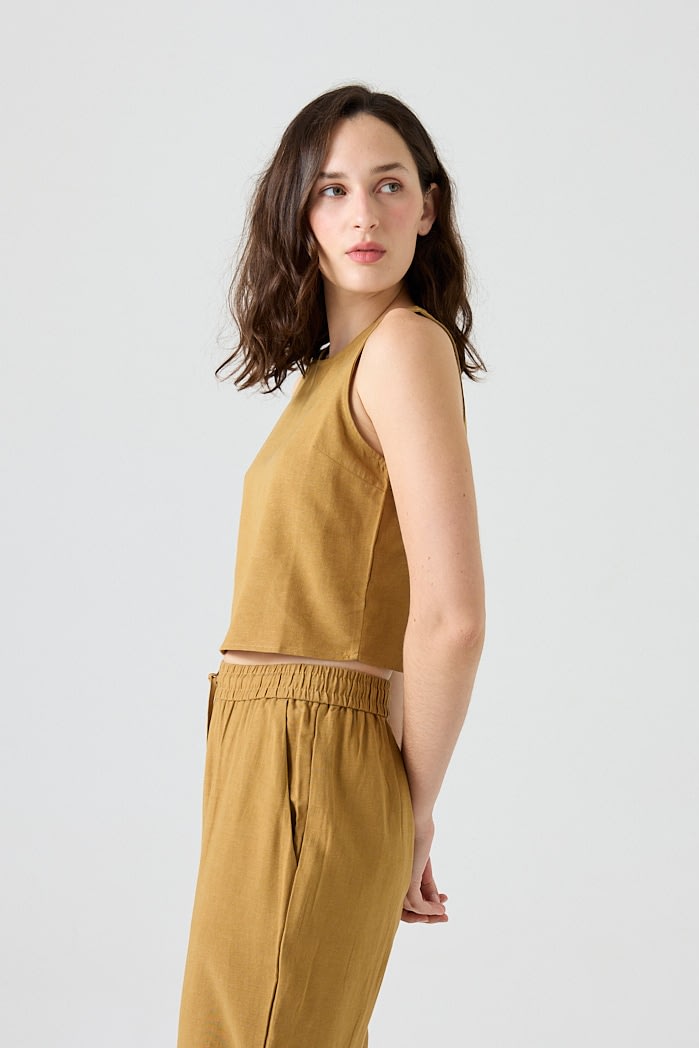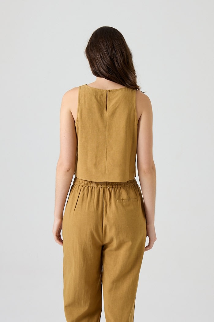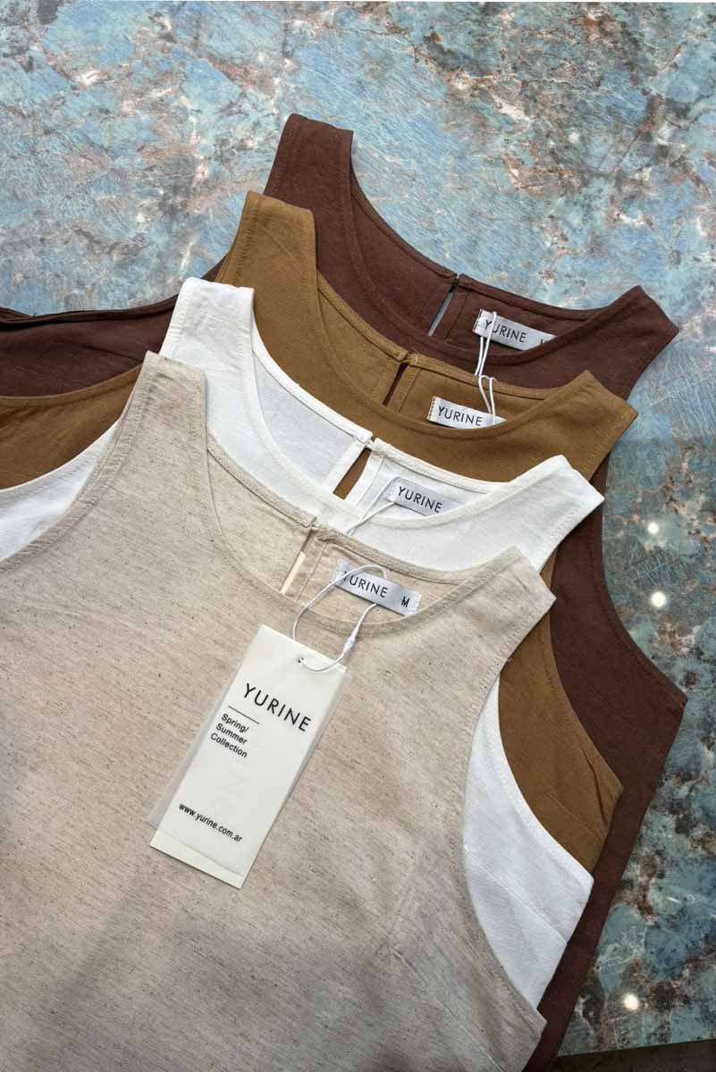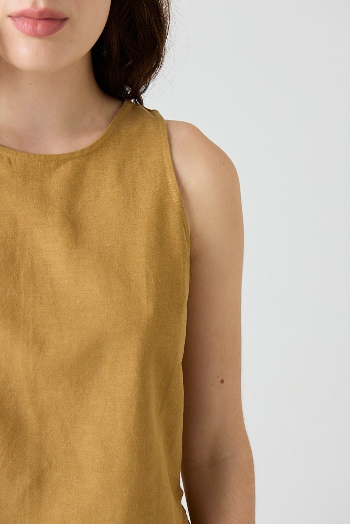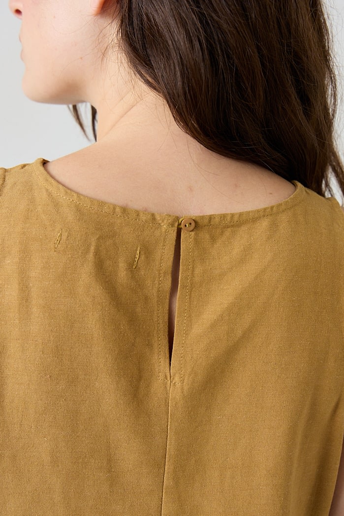 Top corto confeccionado en lino liviano, con escote redondo y espalda con abertura y cierre por botón. De silueta amplia y corte recto. Composición: 75% Algodón 25% Lino