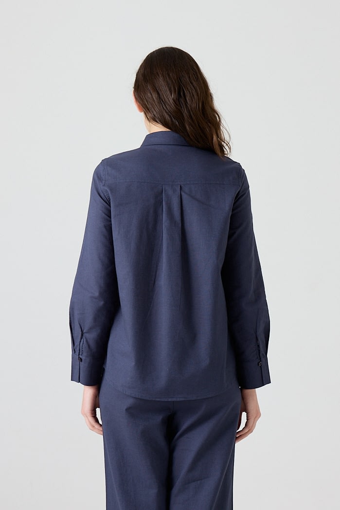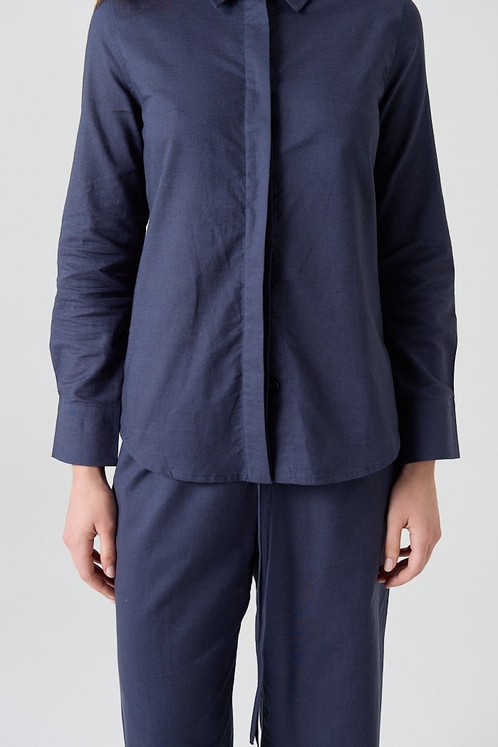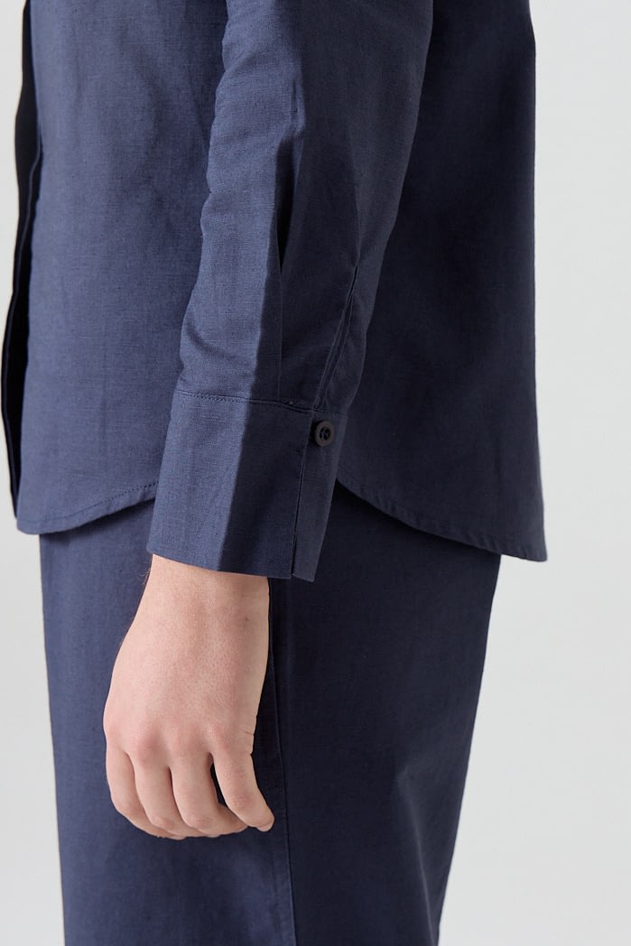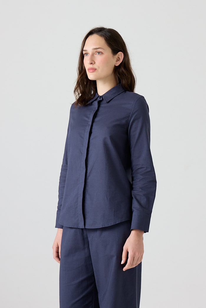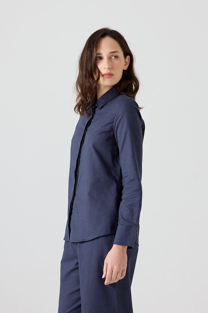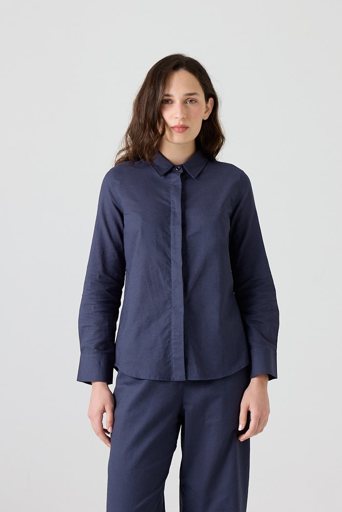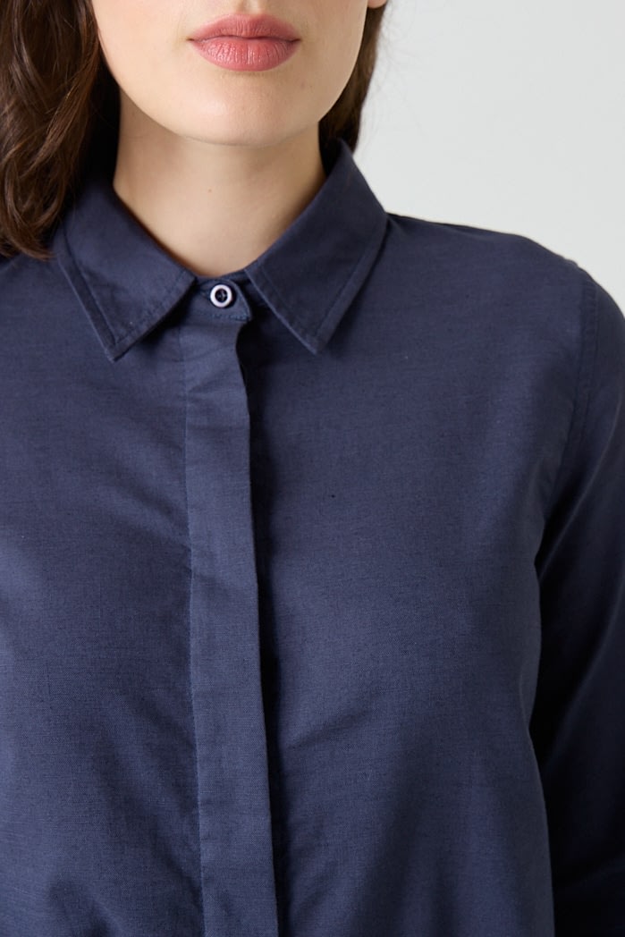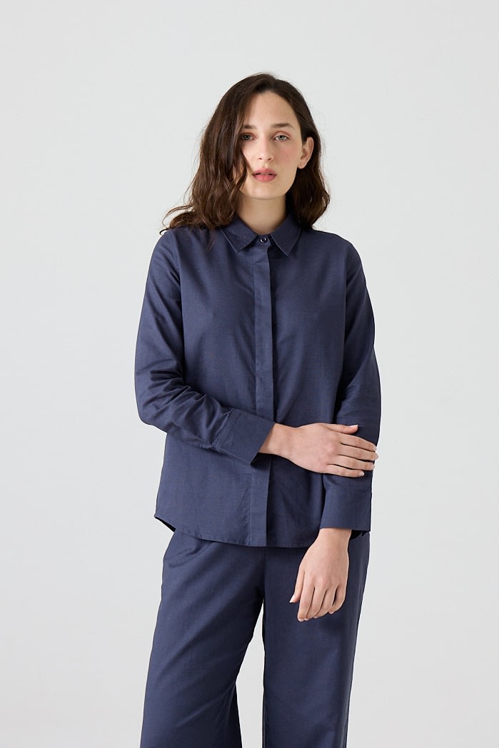 Camisa de corte recto confeccionada en 55% Algodón 45% Lino, con cuello clásico, cierre con tapeta oculta y mangas largas.