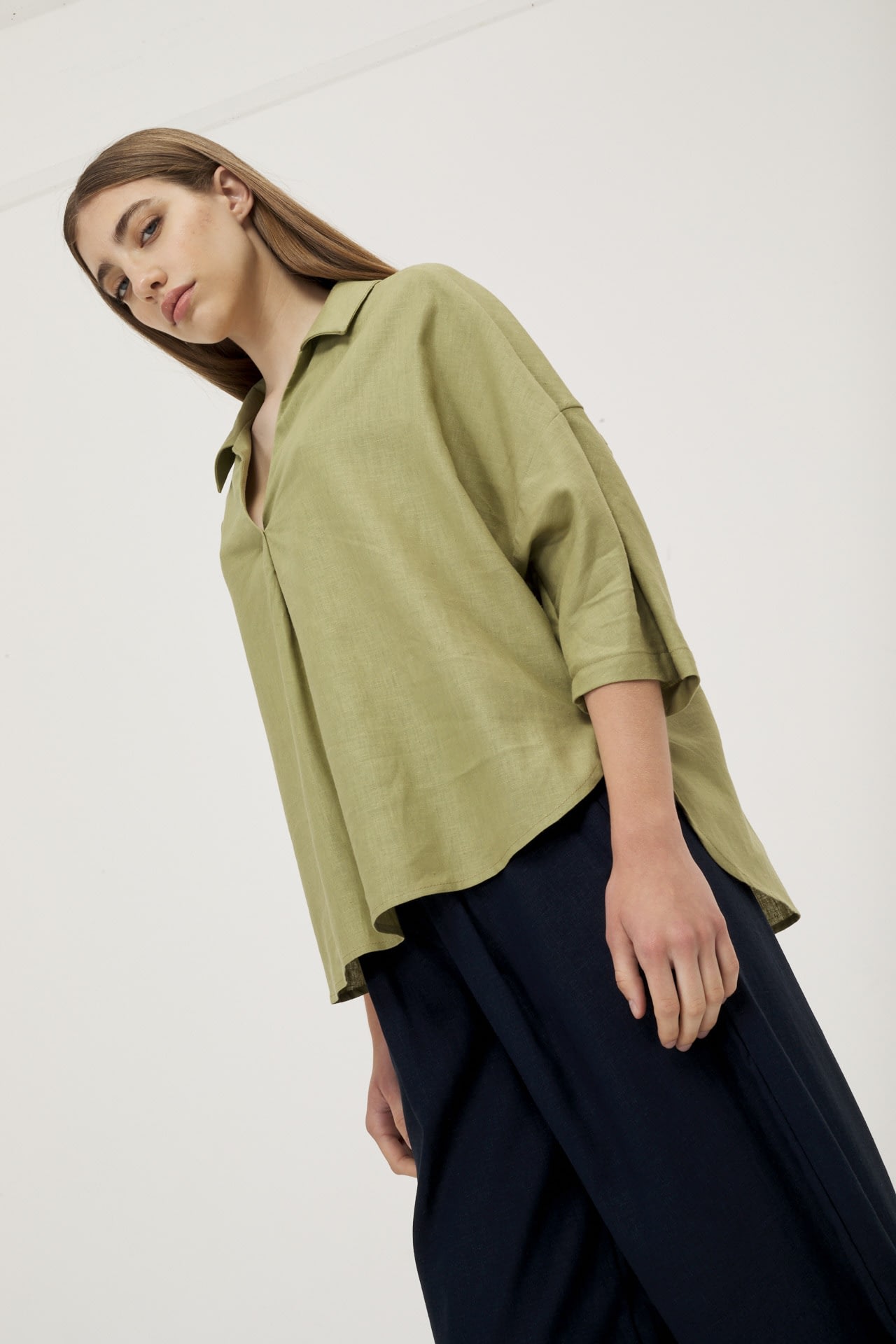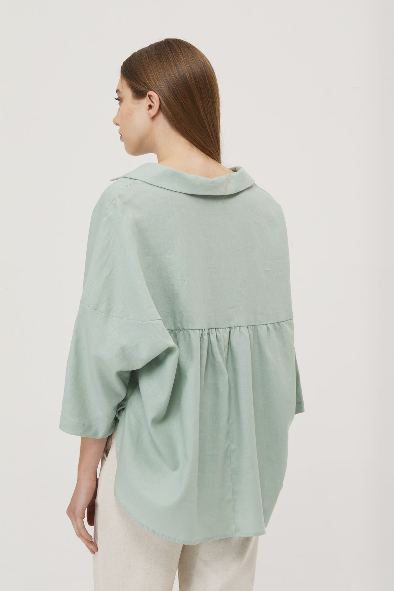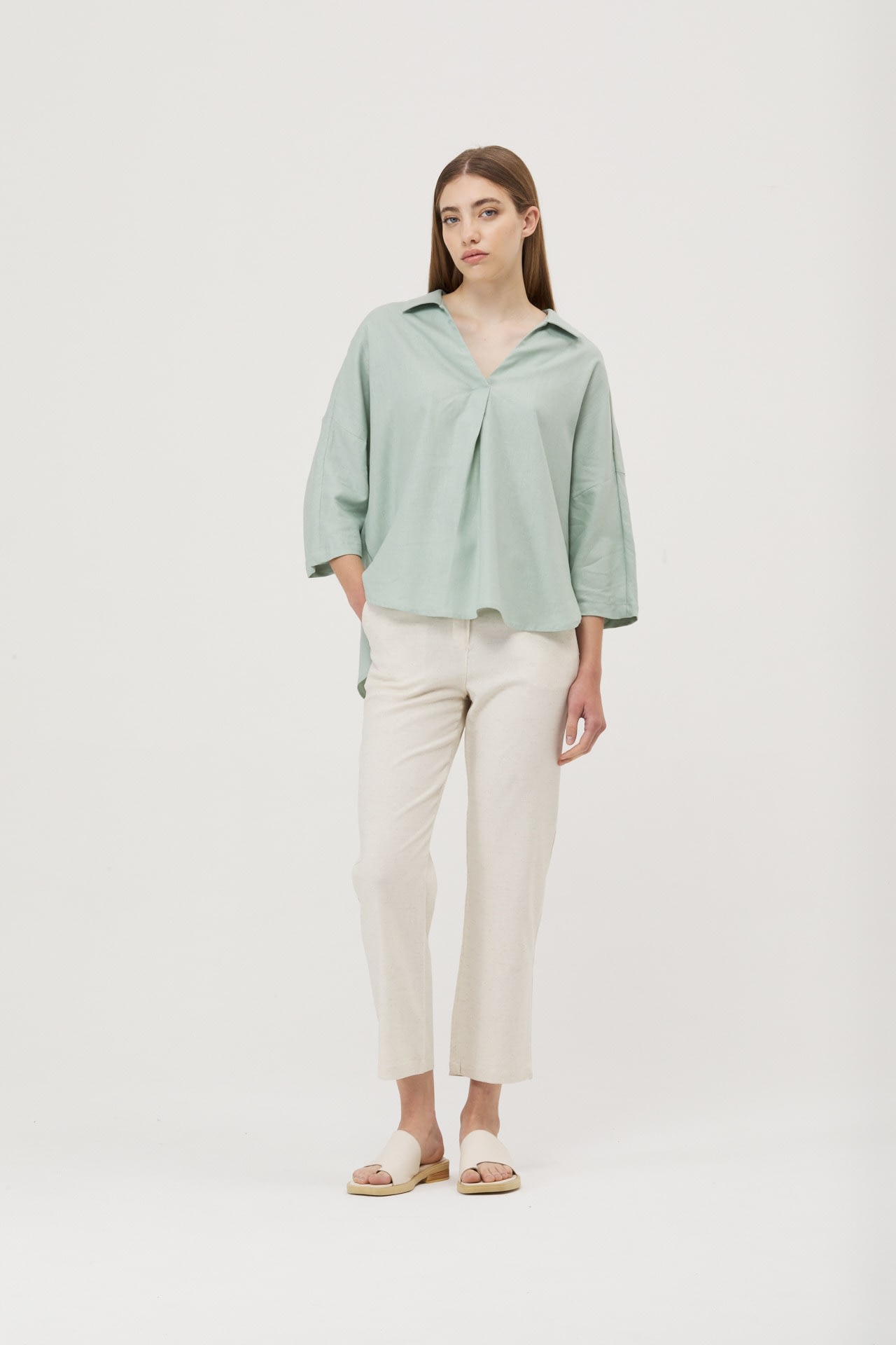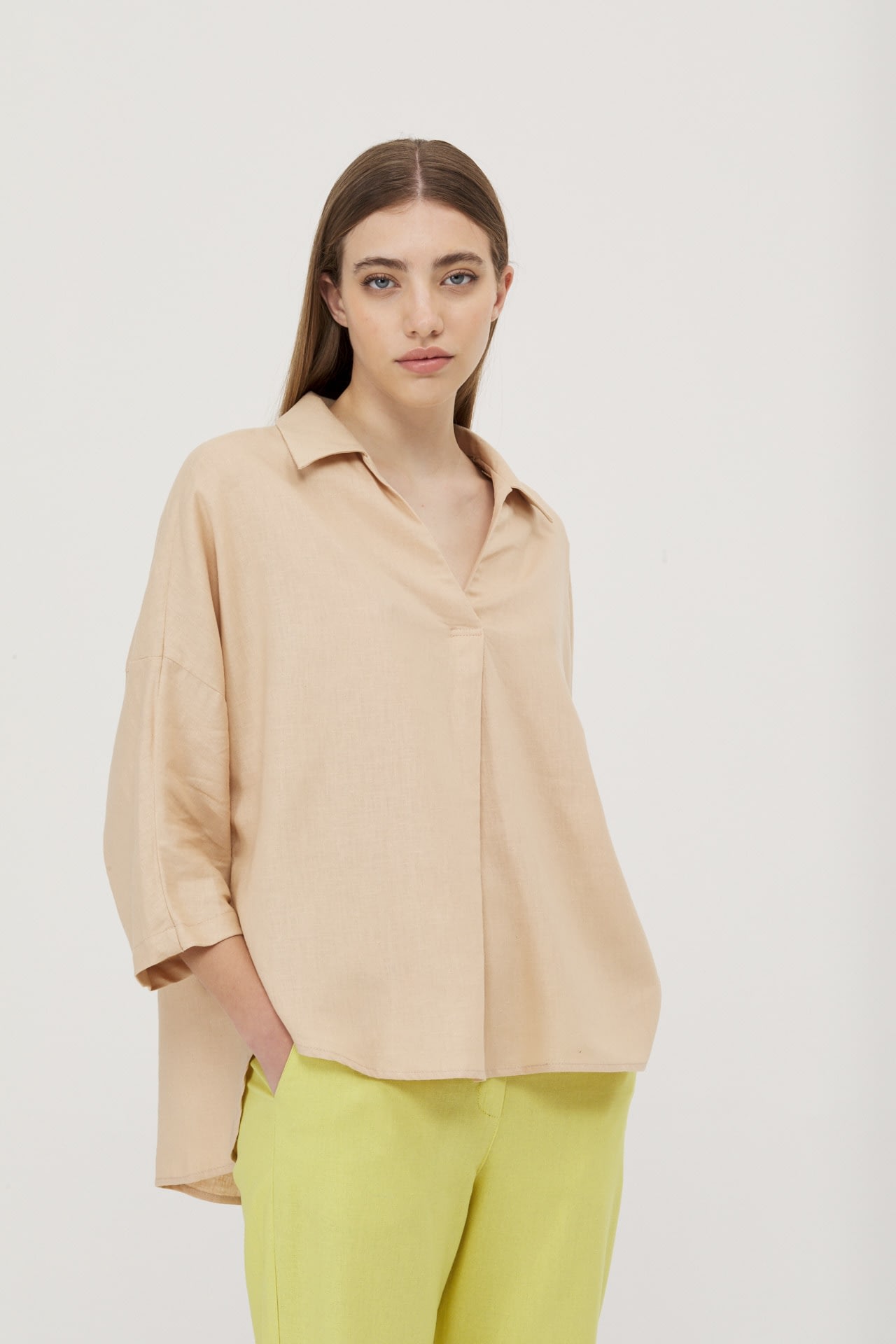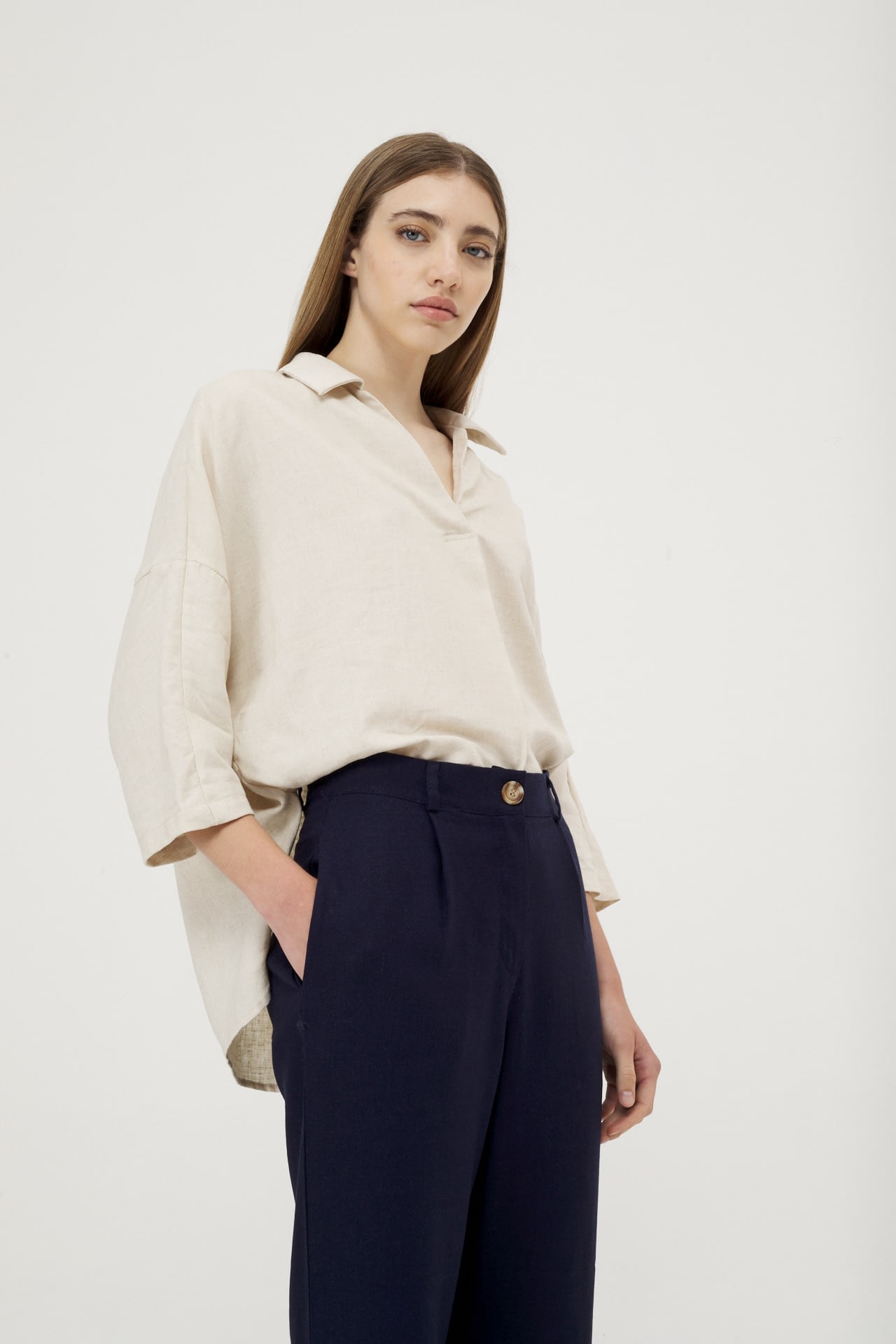 Camisola de lino real manga 3/4, hombro caido y espalda con recorte.