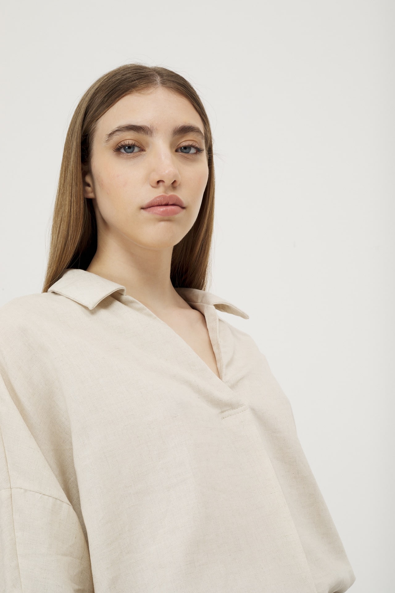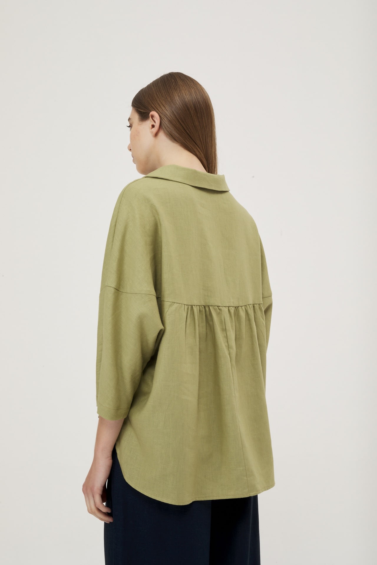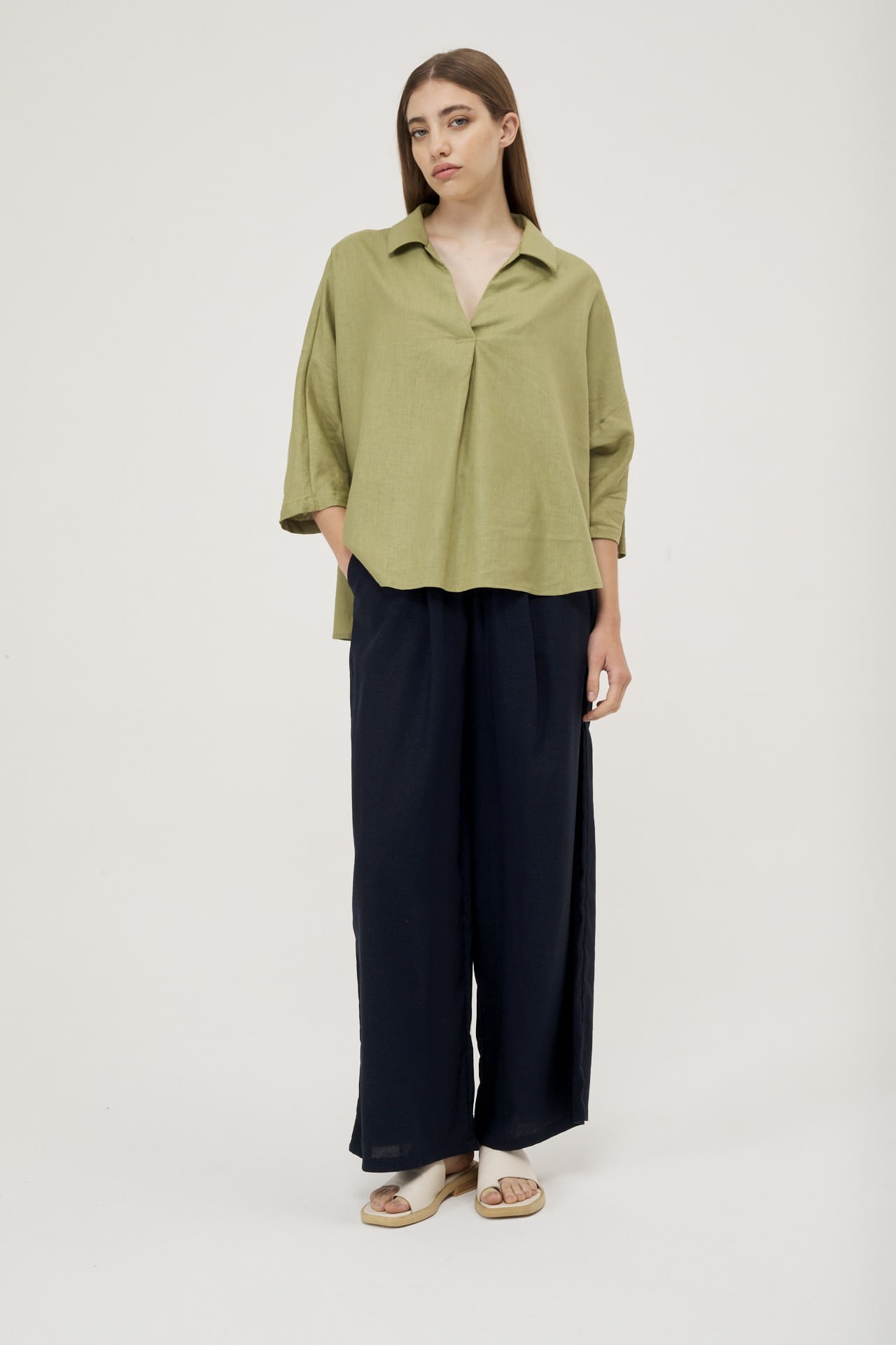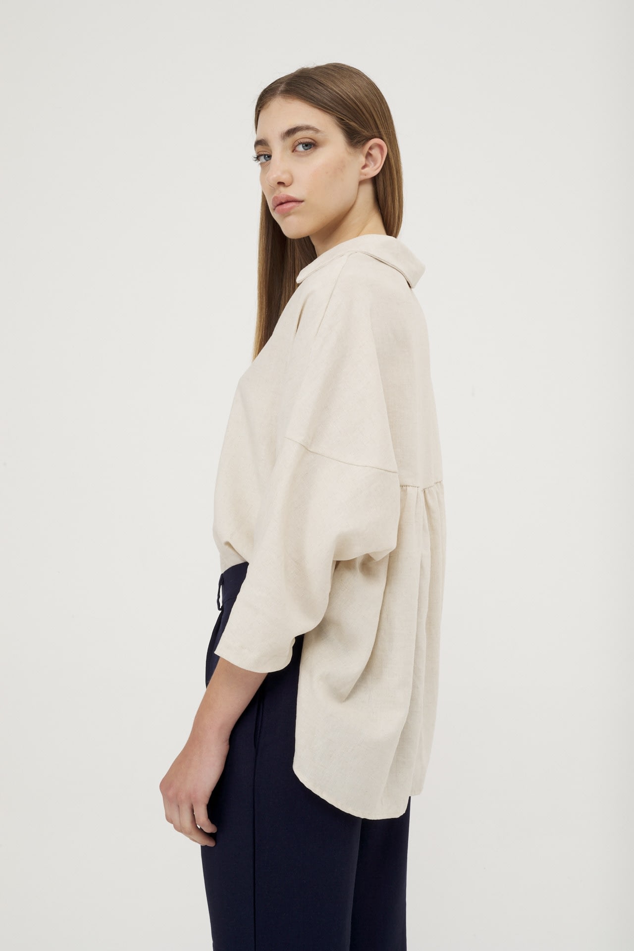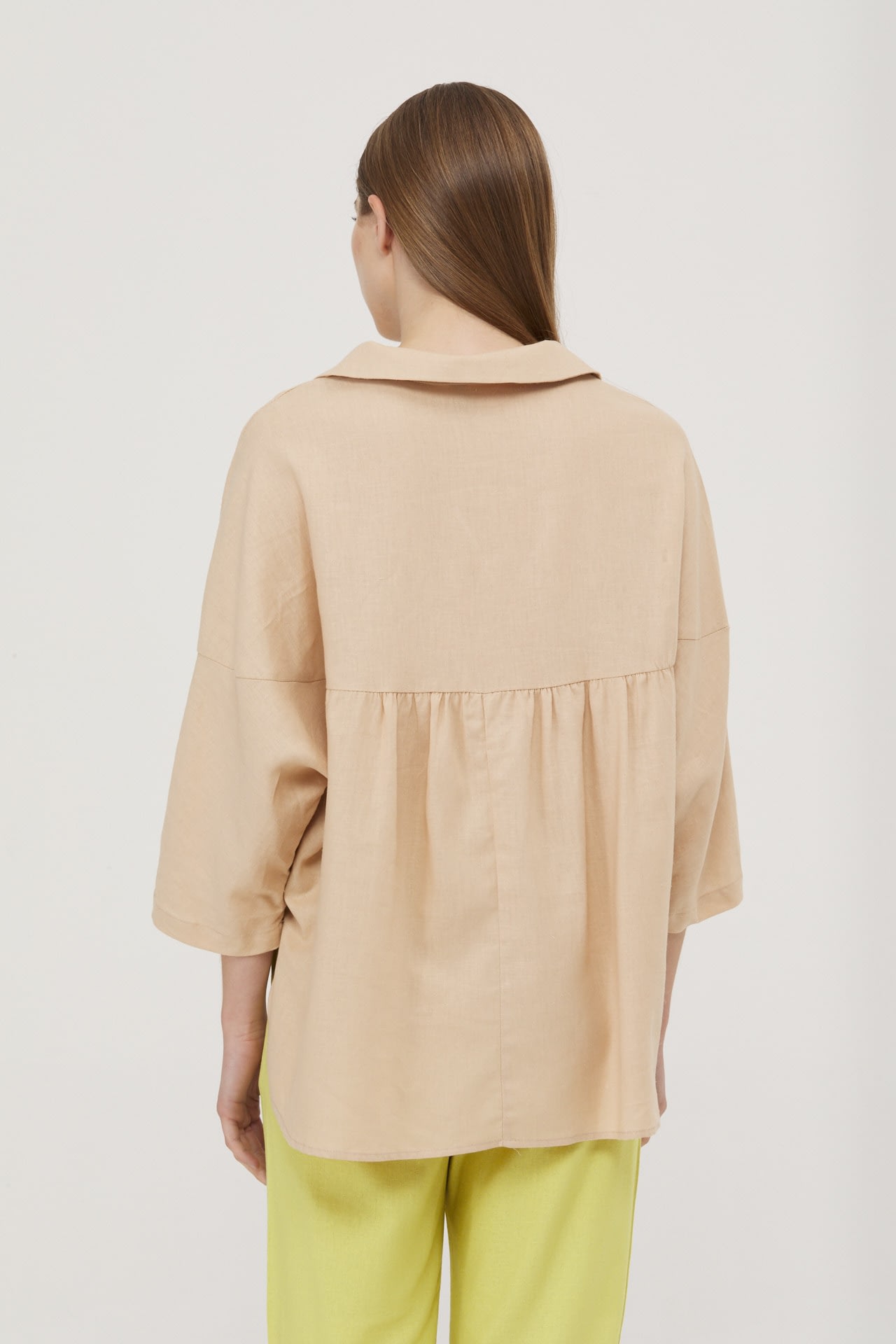 Camisola de lino real manga 3/4, hombro caido y espalda con recorte.
