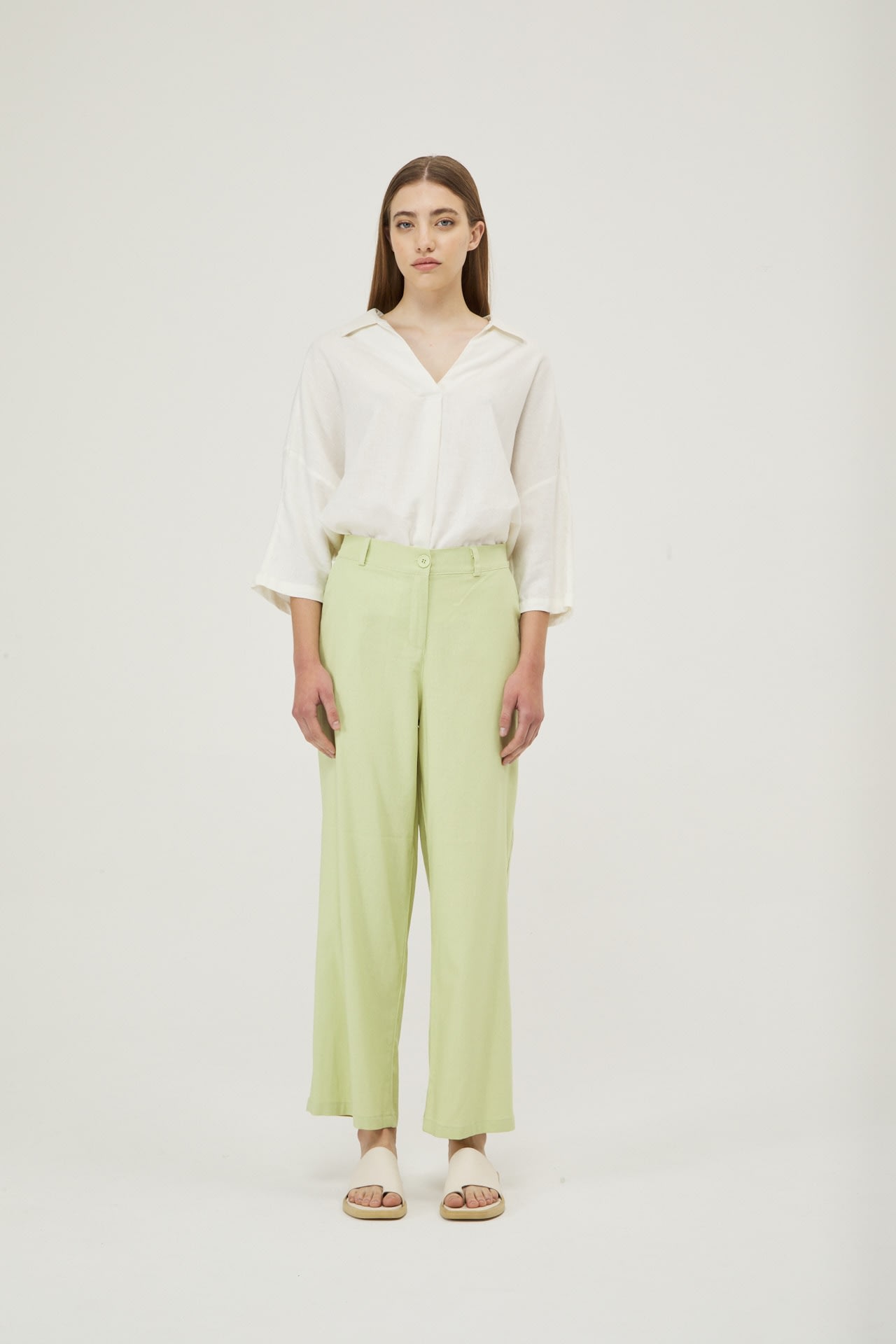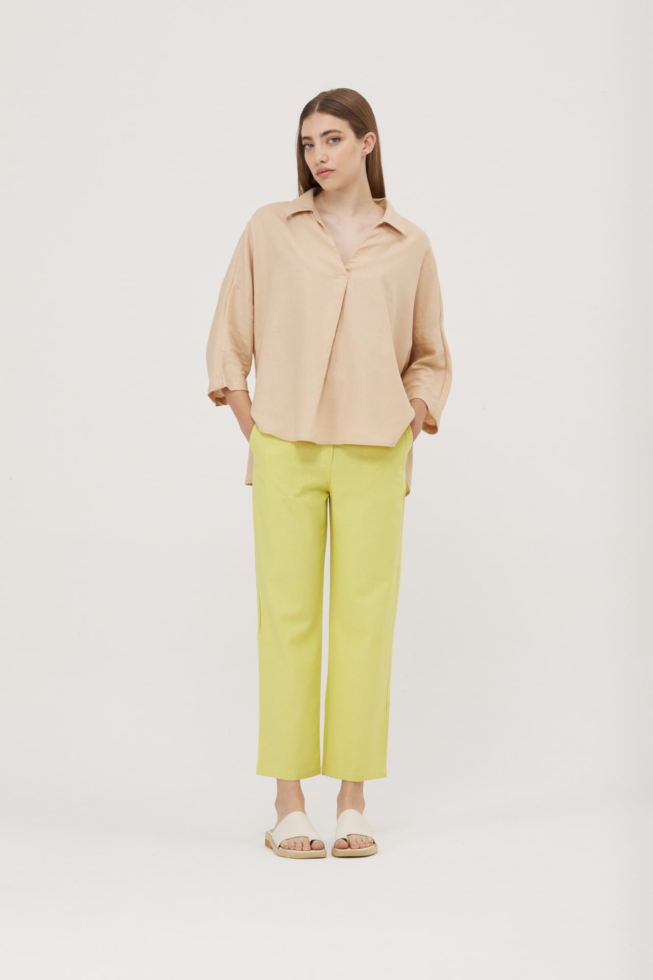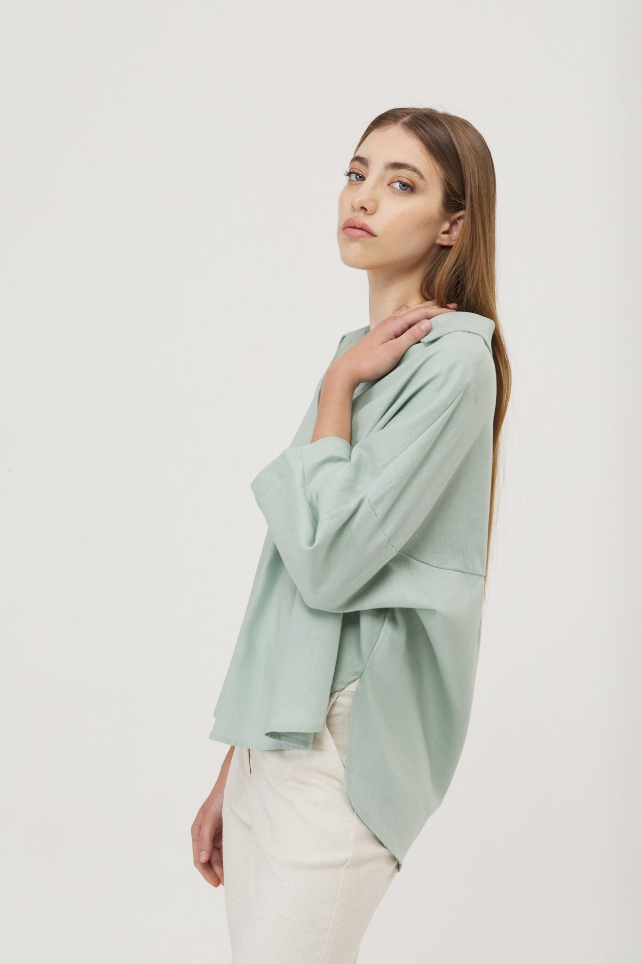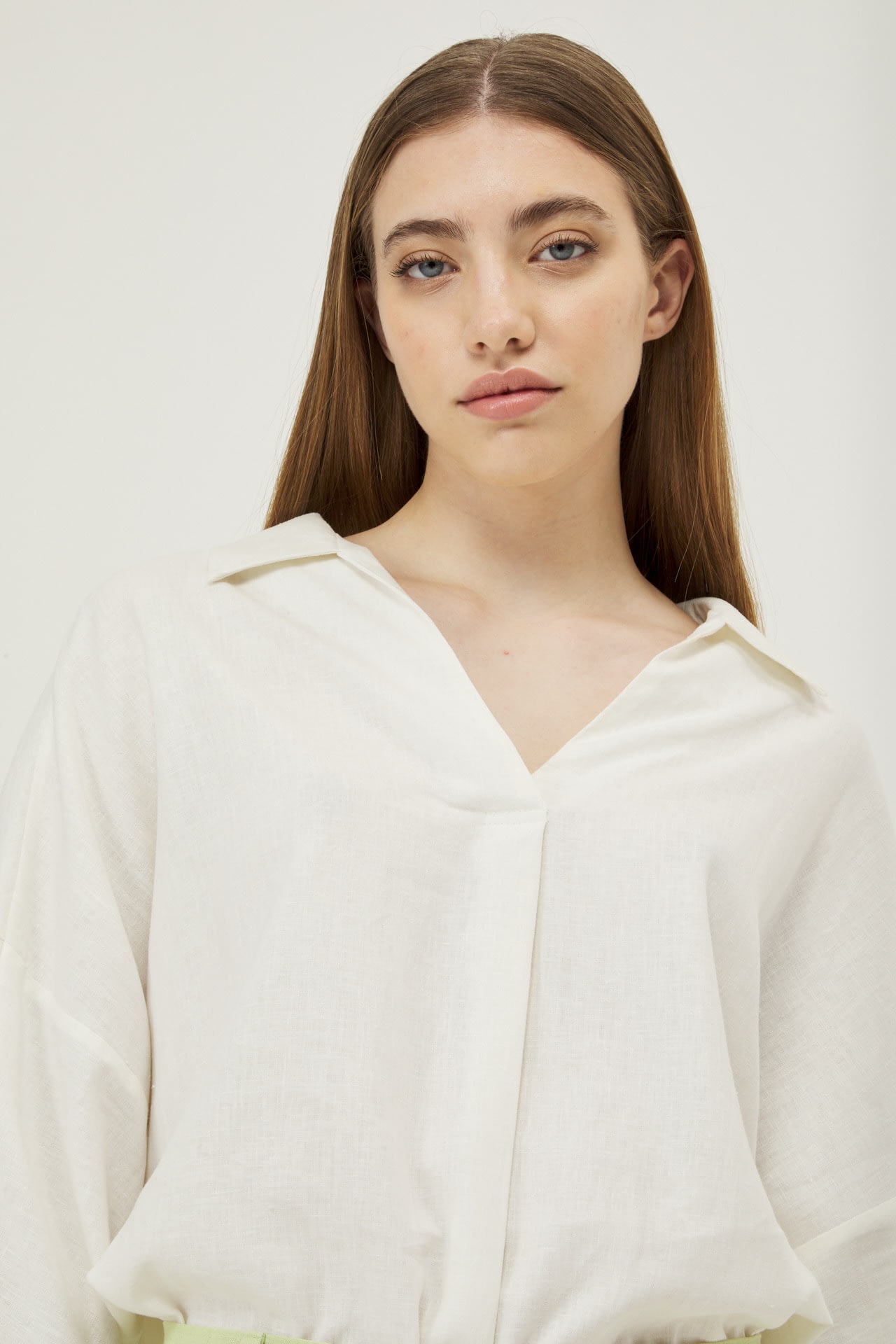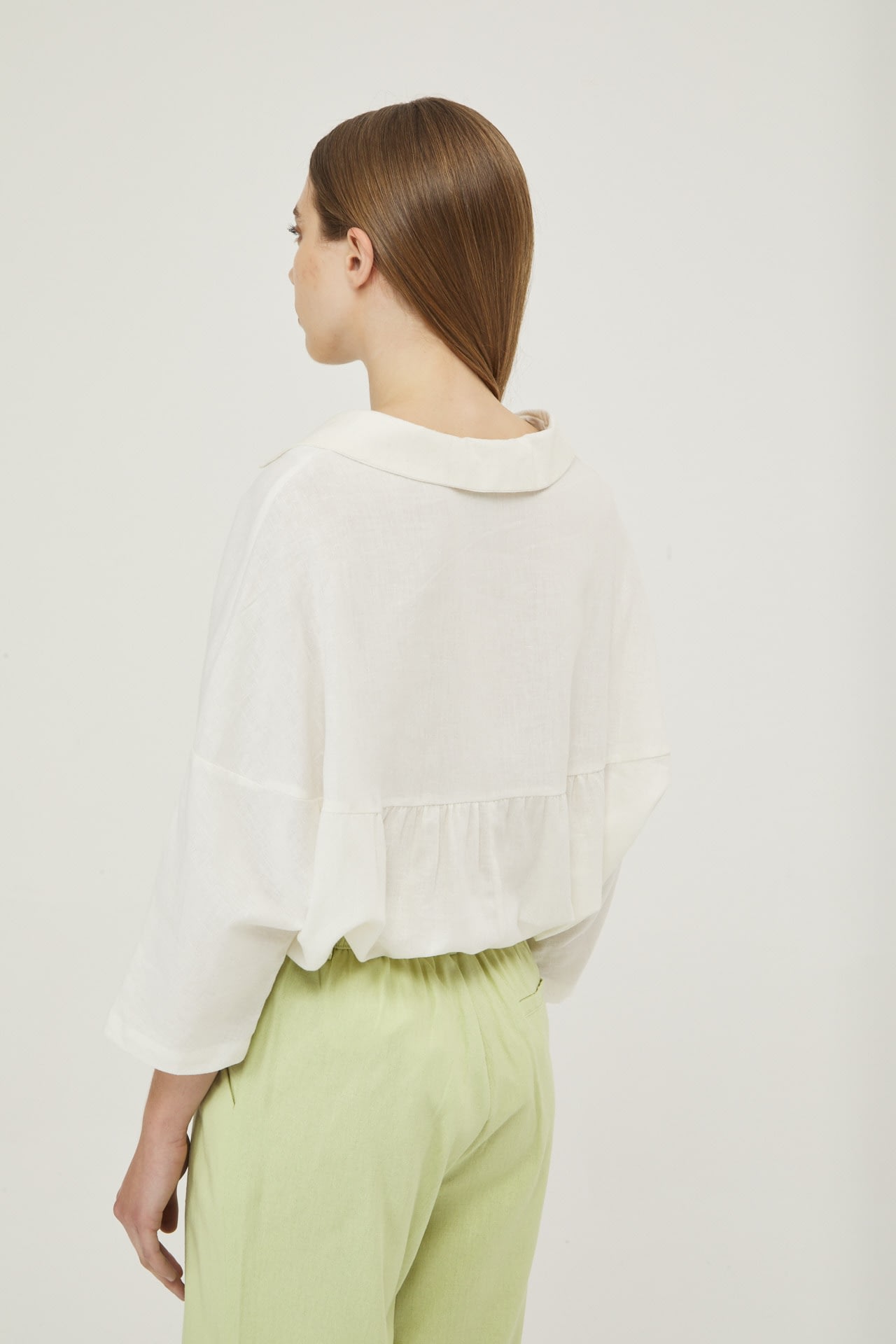 Camisola de lino real manga 3/4, hombro caido y espalda con recorte.