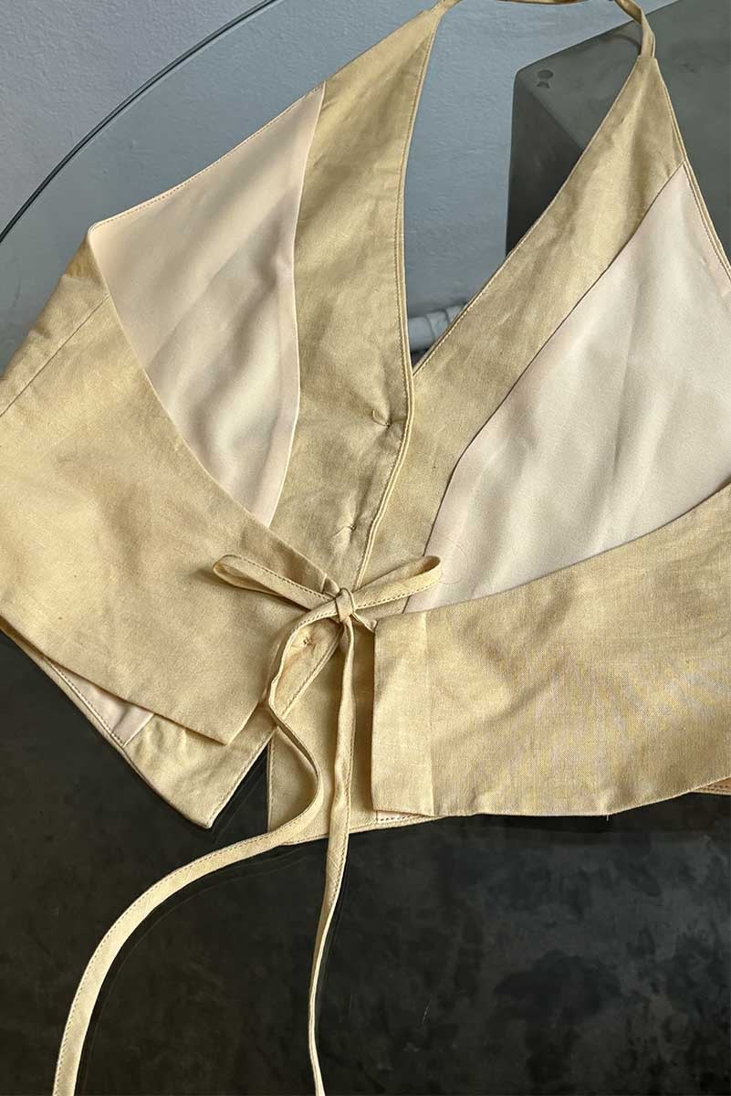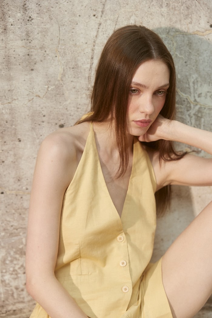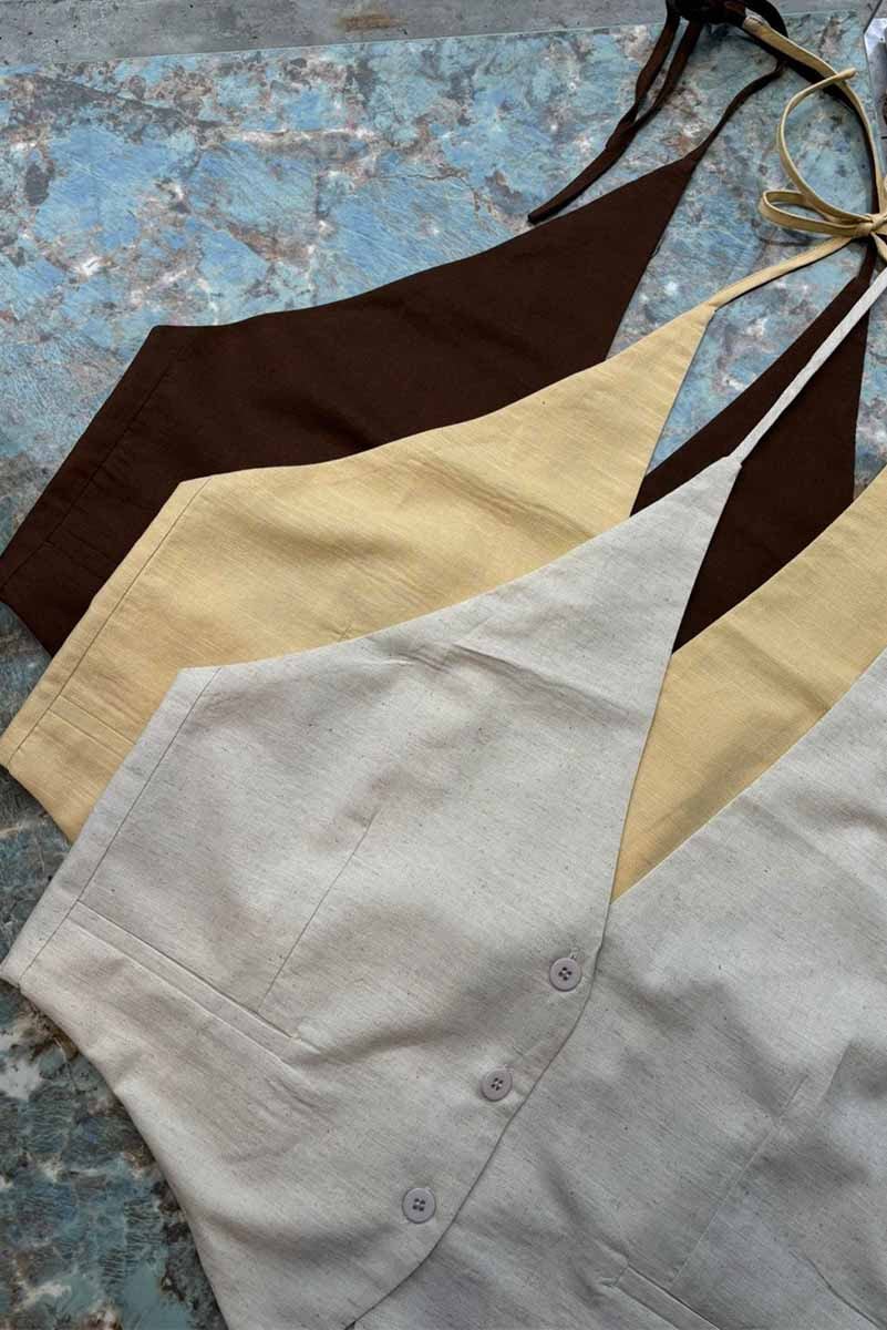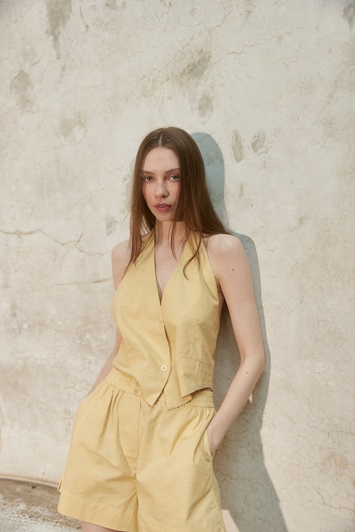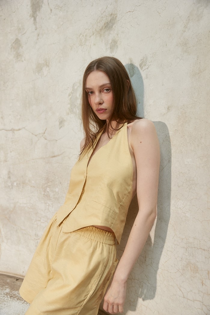 Chaleco de lino con escote en “V” y botones al frente. Diseño con espalda descubierta.Composición: 70% Viscosa 30% Lino