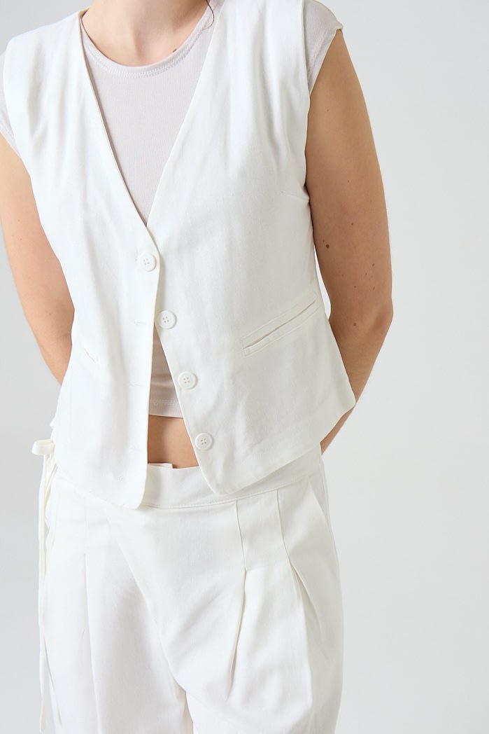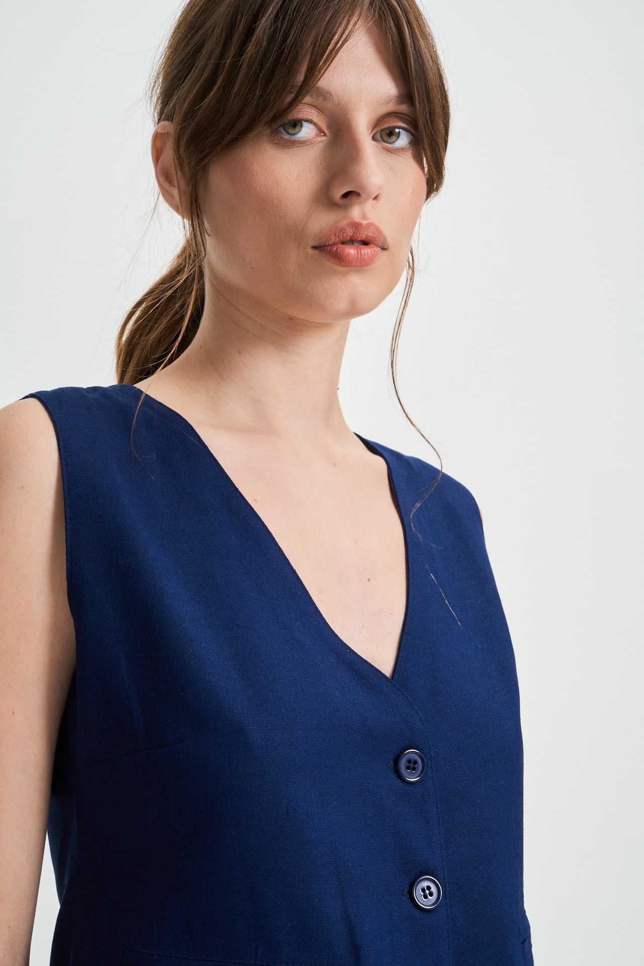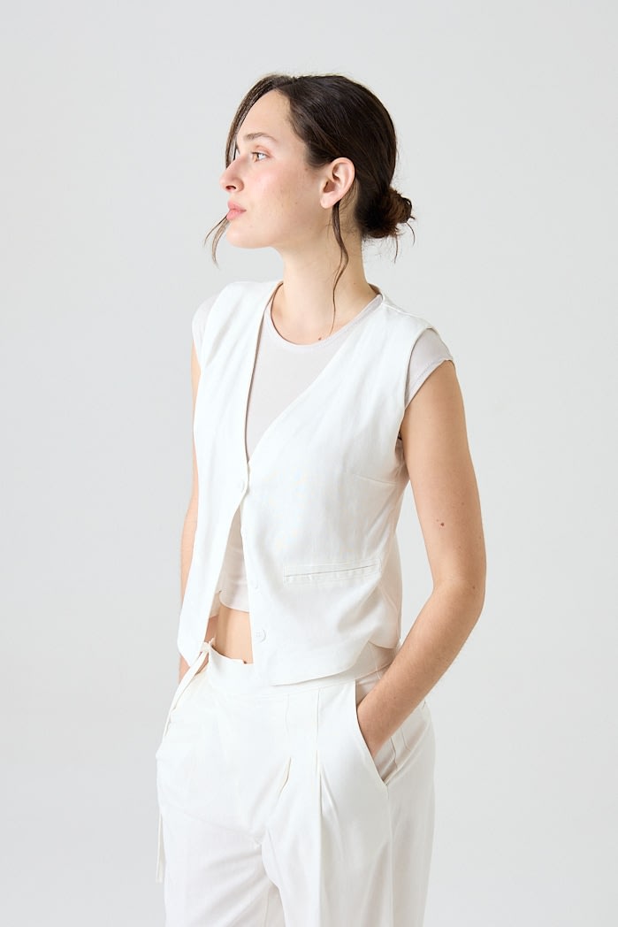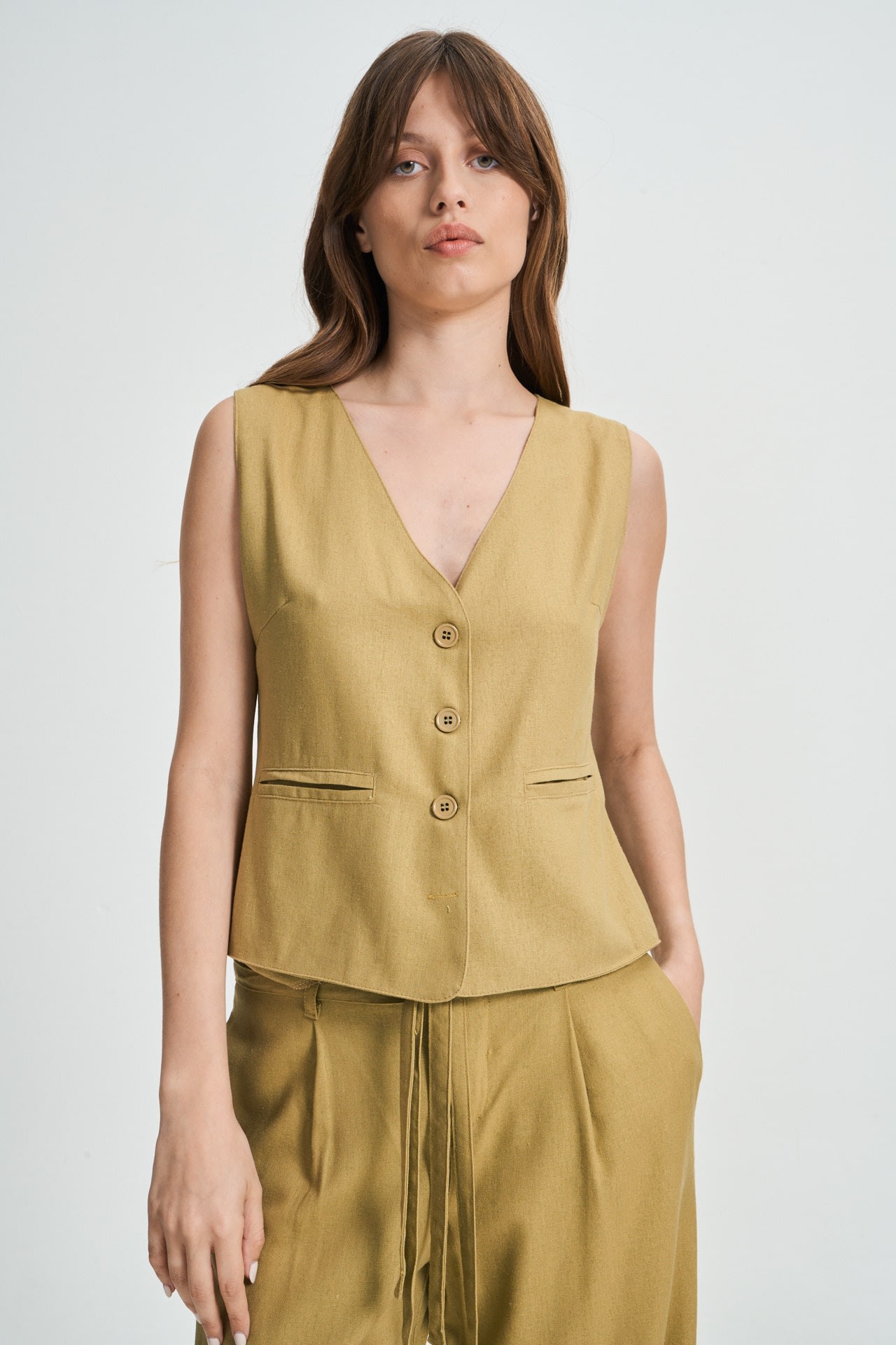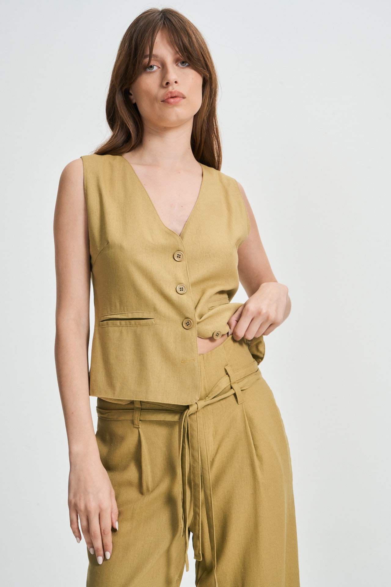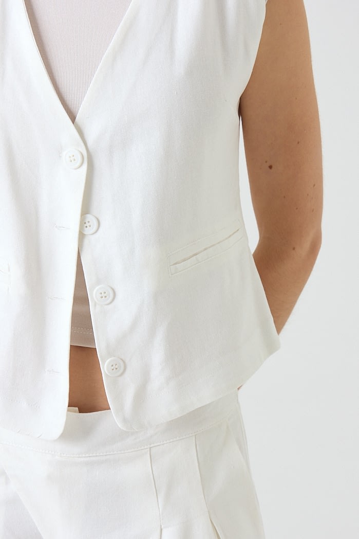 Chaleco de lino SIN FORRAR modelo corto y entallado. Con bolsillos falsos.