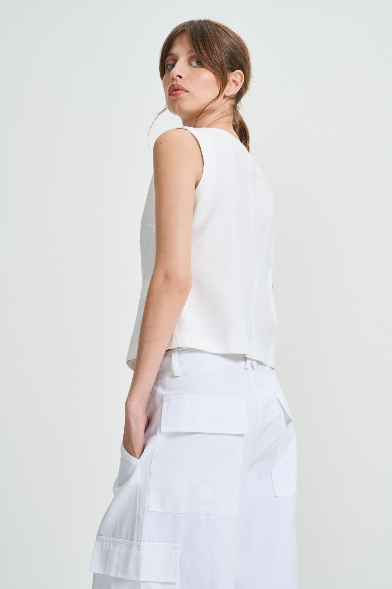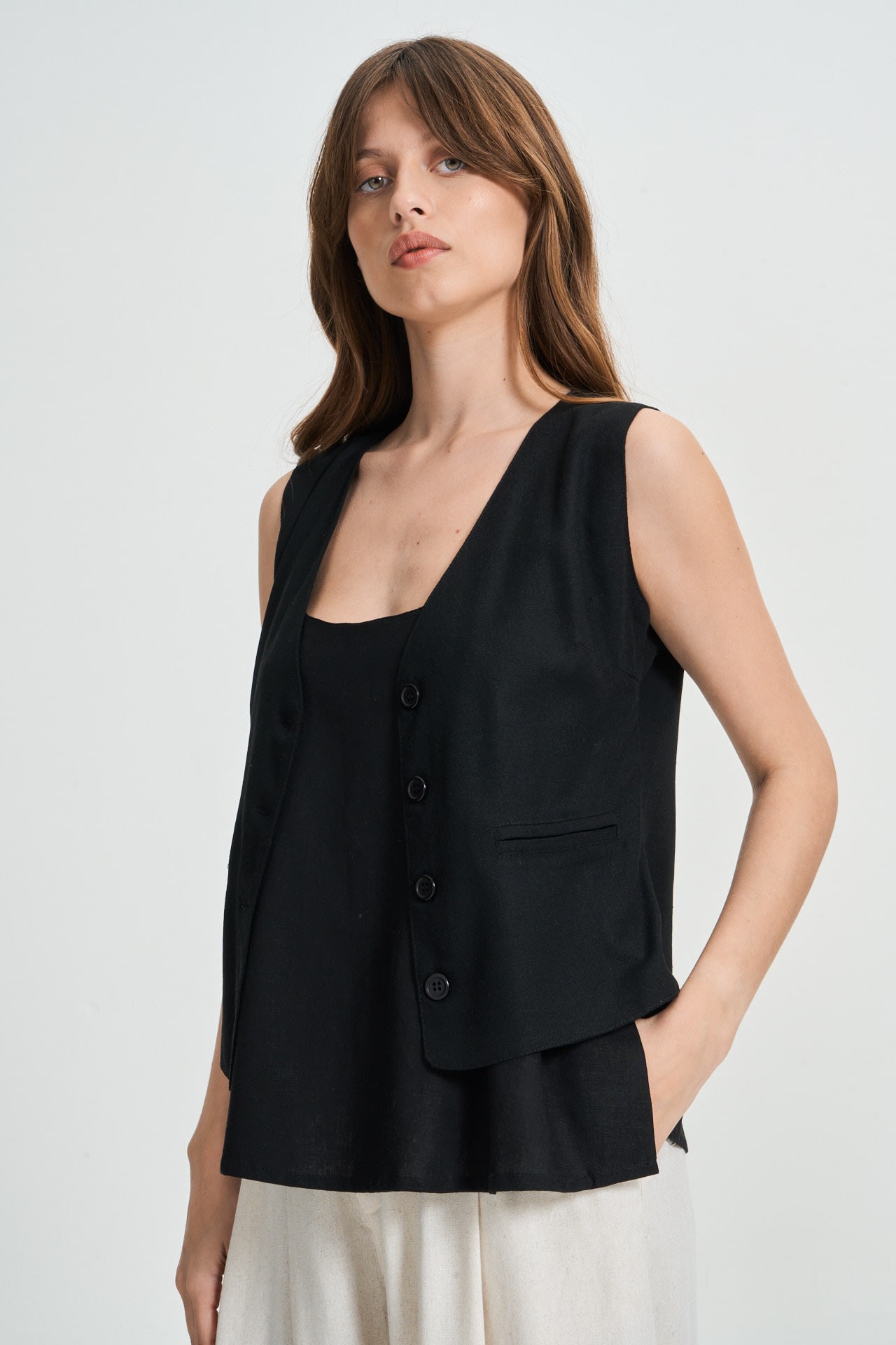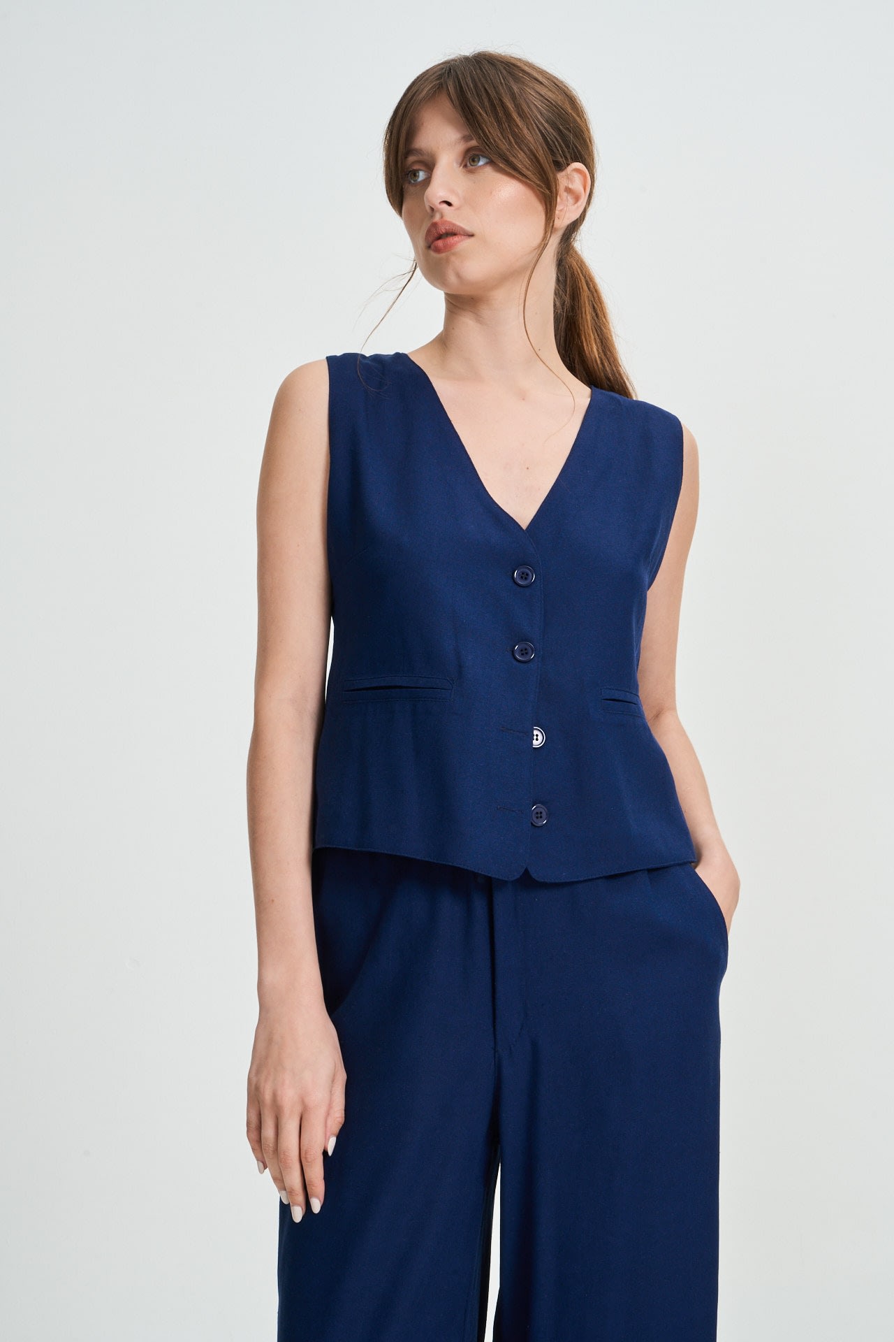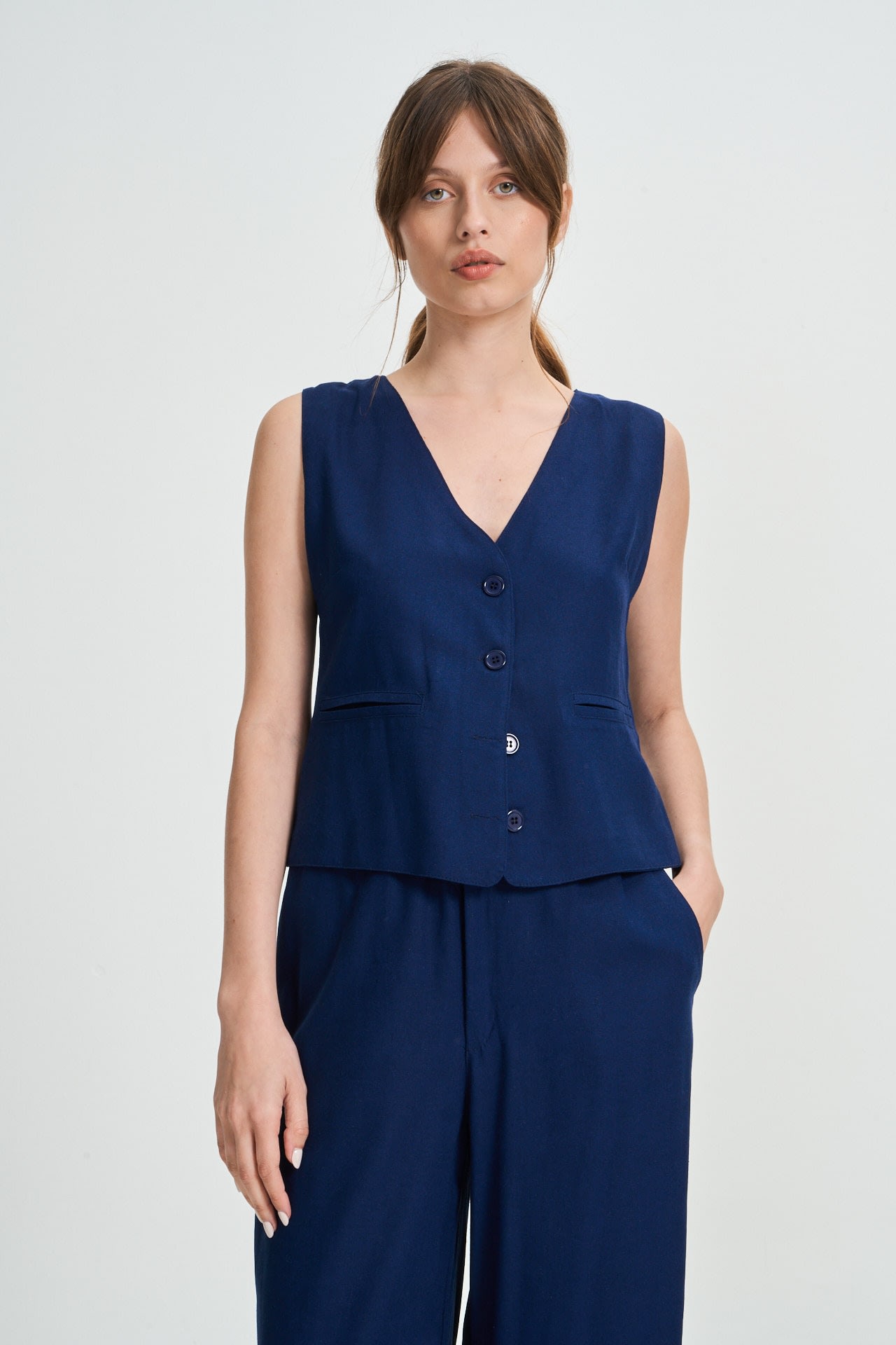 Chaleco de lino SIN FORRAR modelo corto y entallado. Con bolsillos falsos.