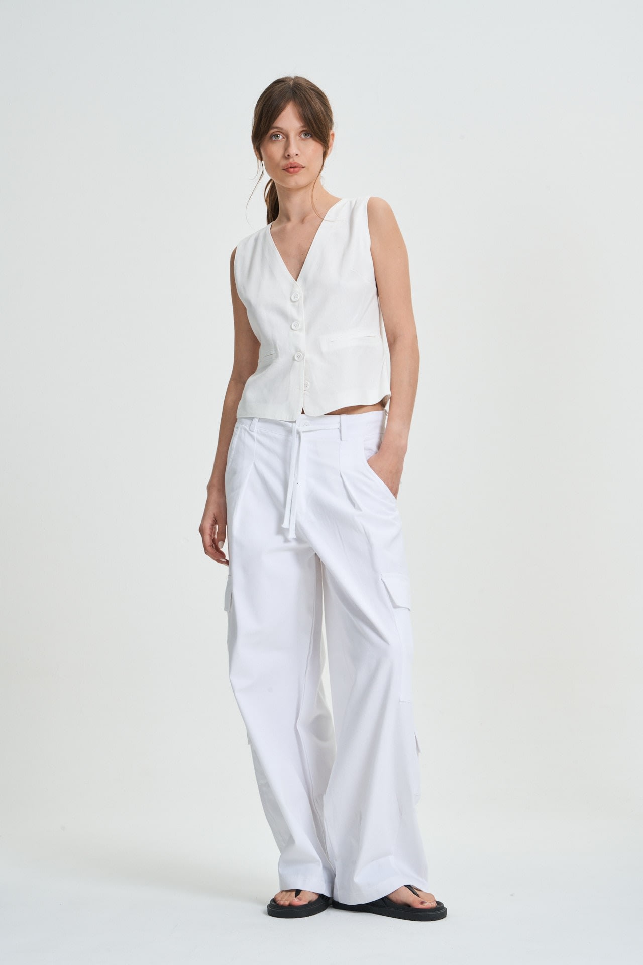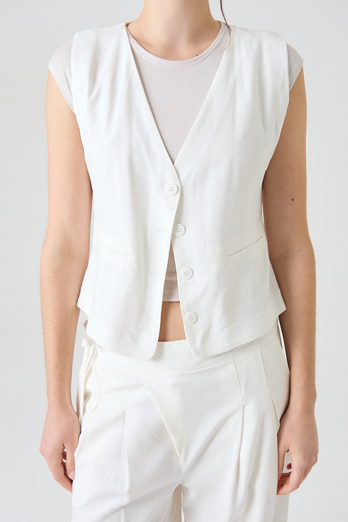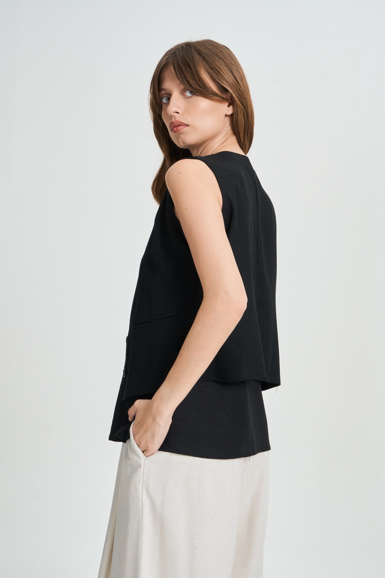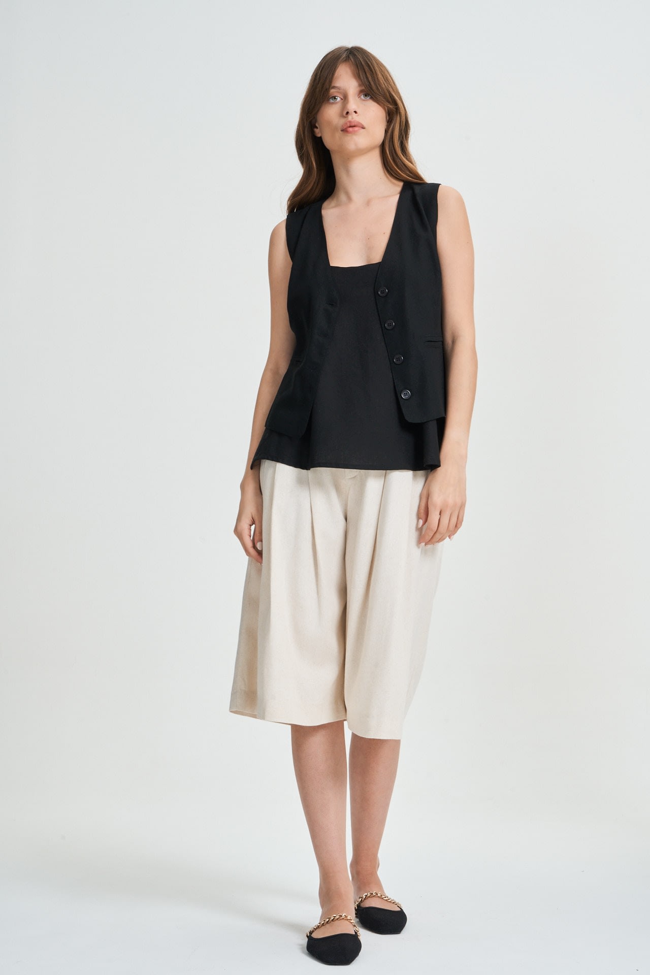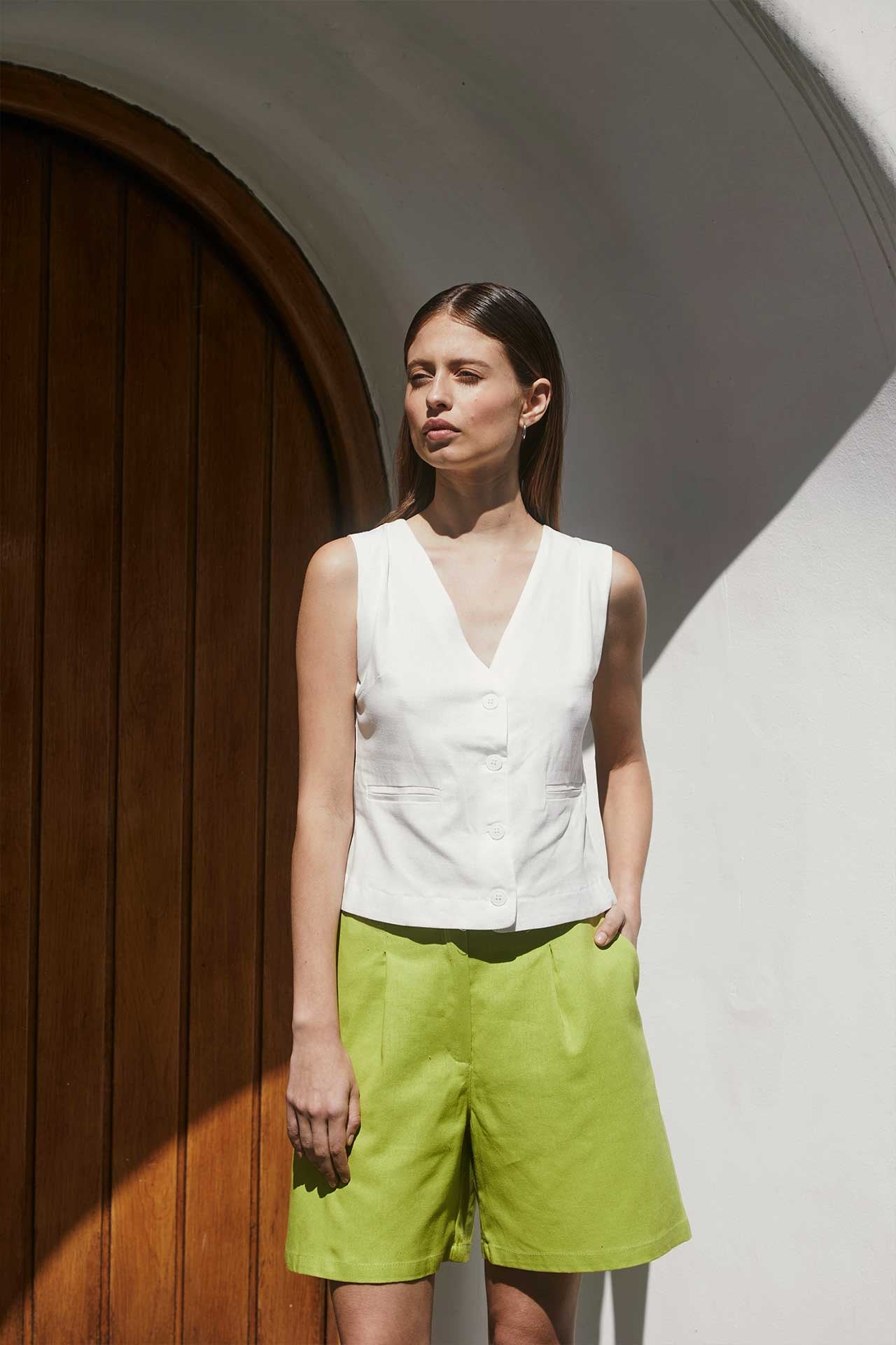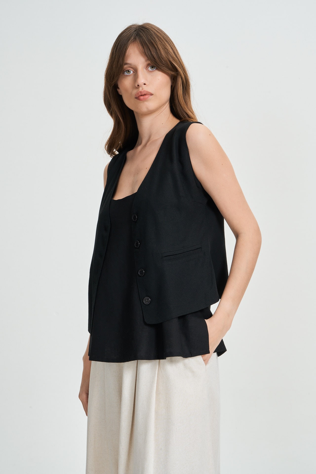 Chaleco de lino SIN FORRAR modelo corto y entallado. Con bolsillos falsos.