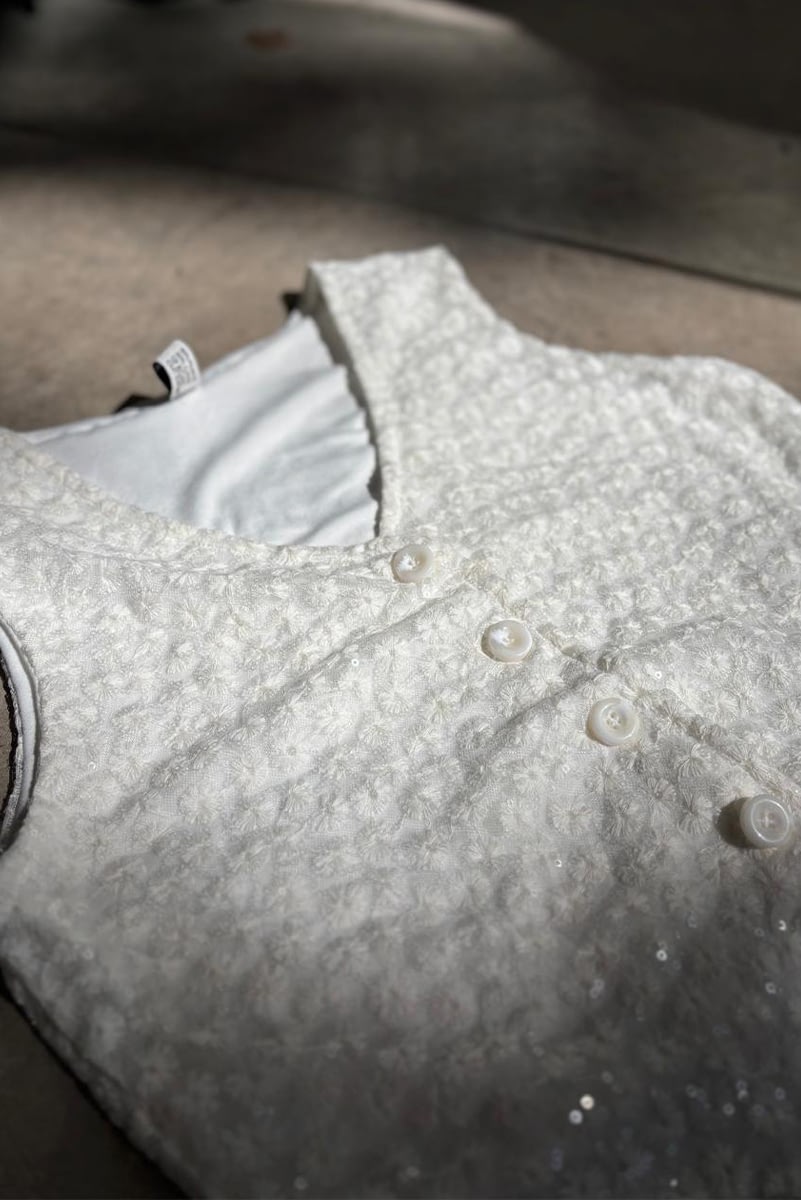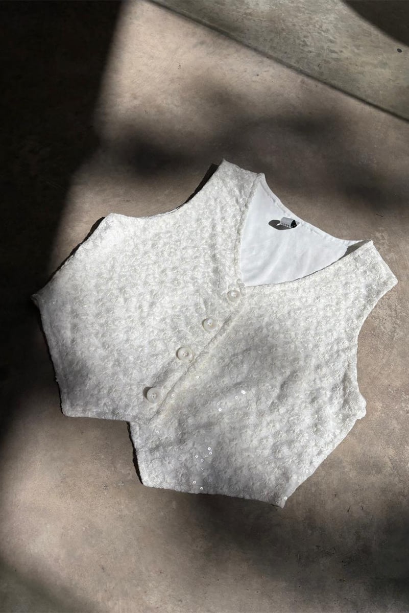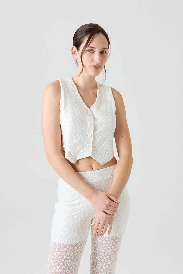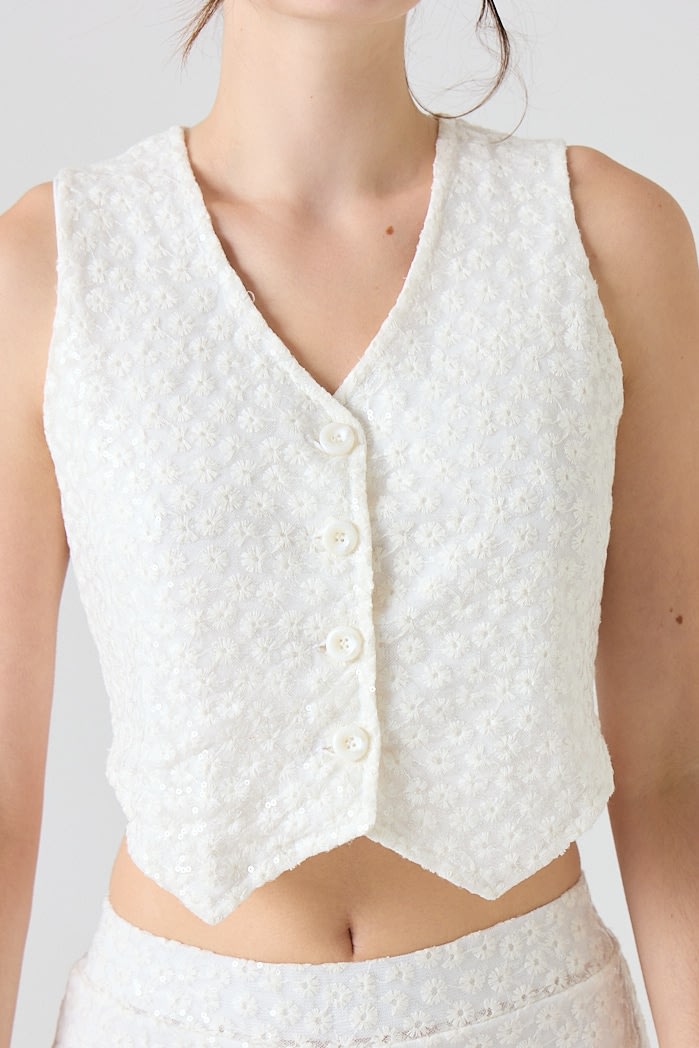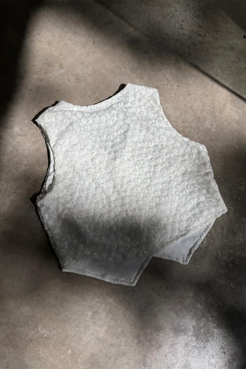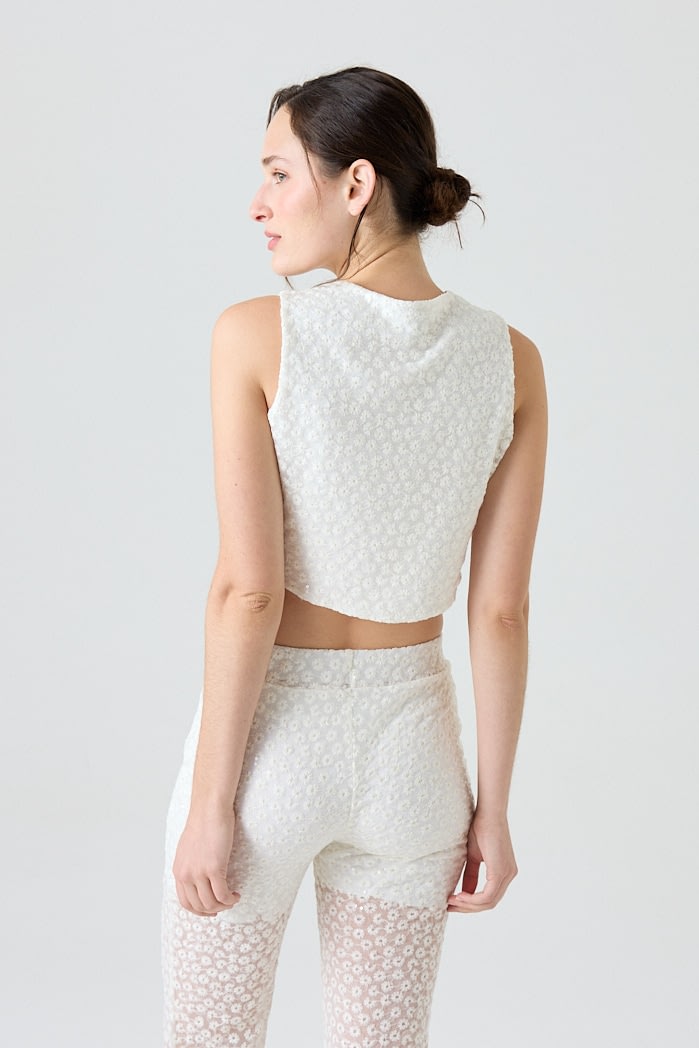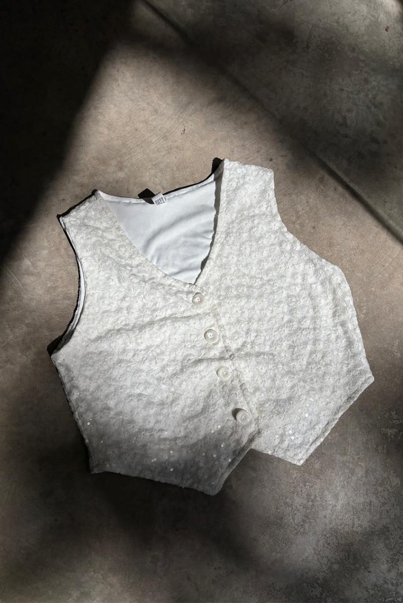 Chaleco corto confeccionado en encaje floral, con sutiles aplicaciones de lentejuelas. Presenta un diseño sin mangas, escote en V y cuatro botones marmolados a tono