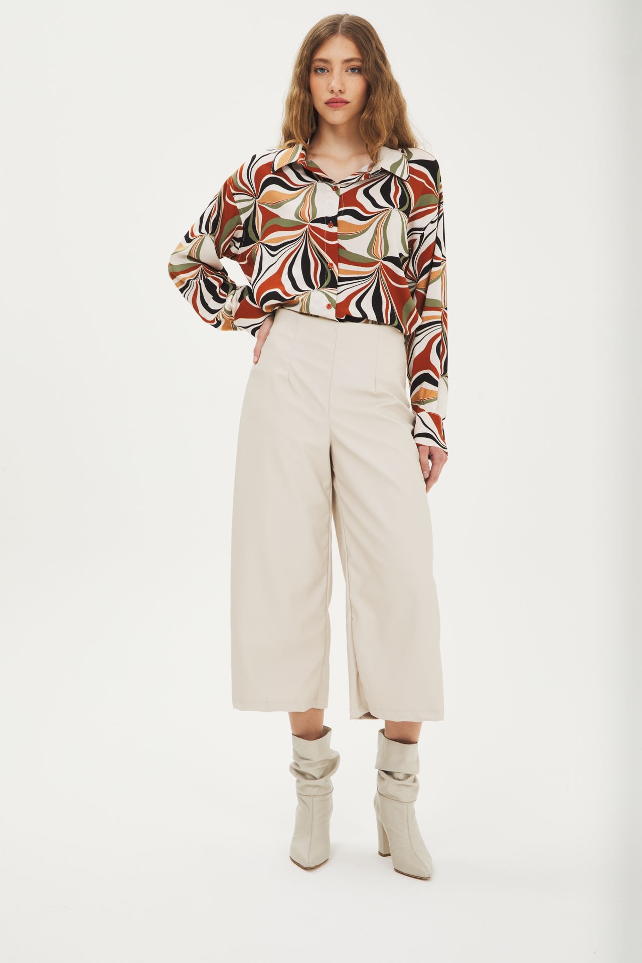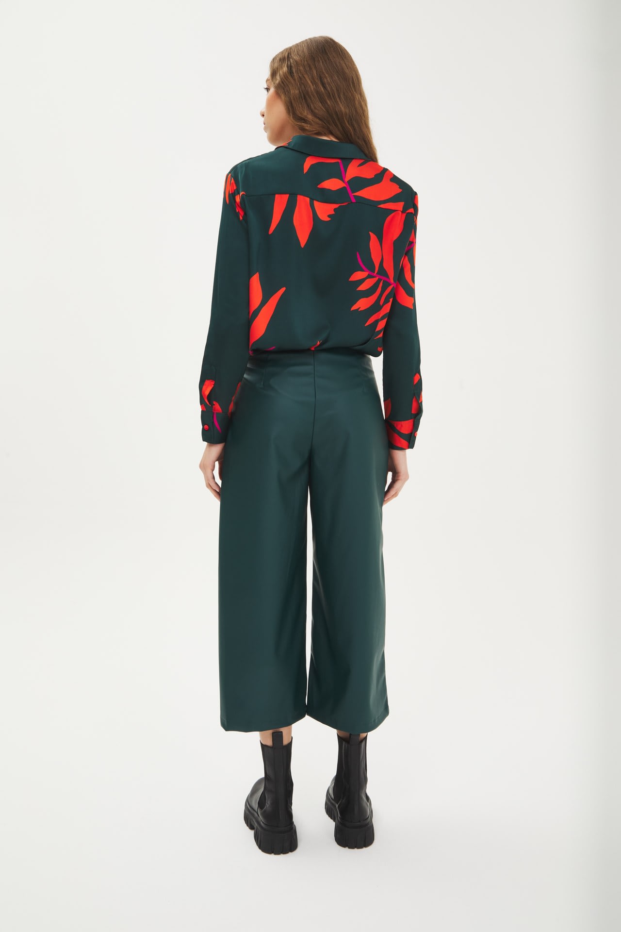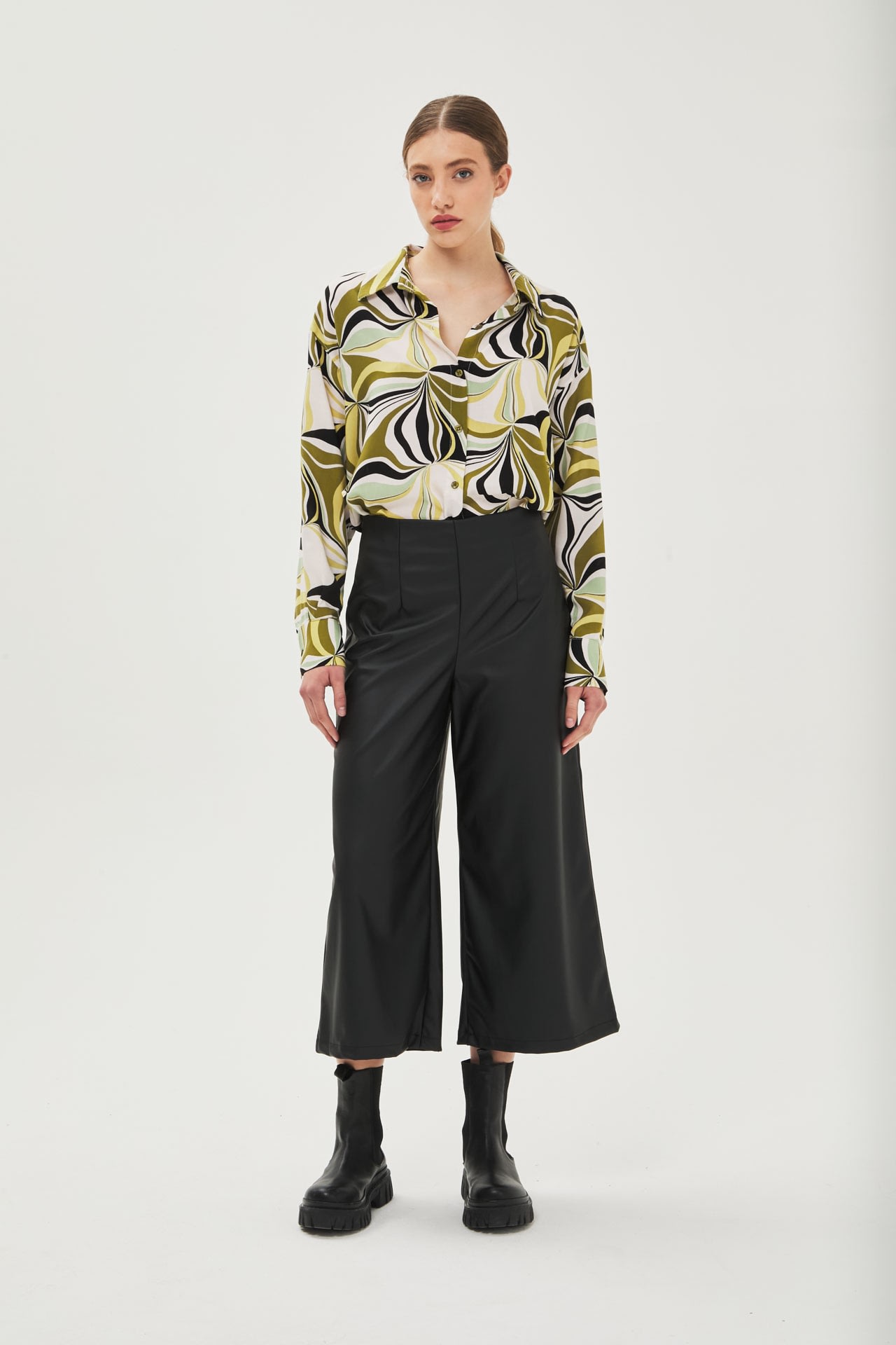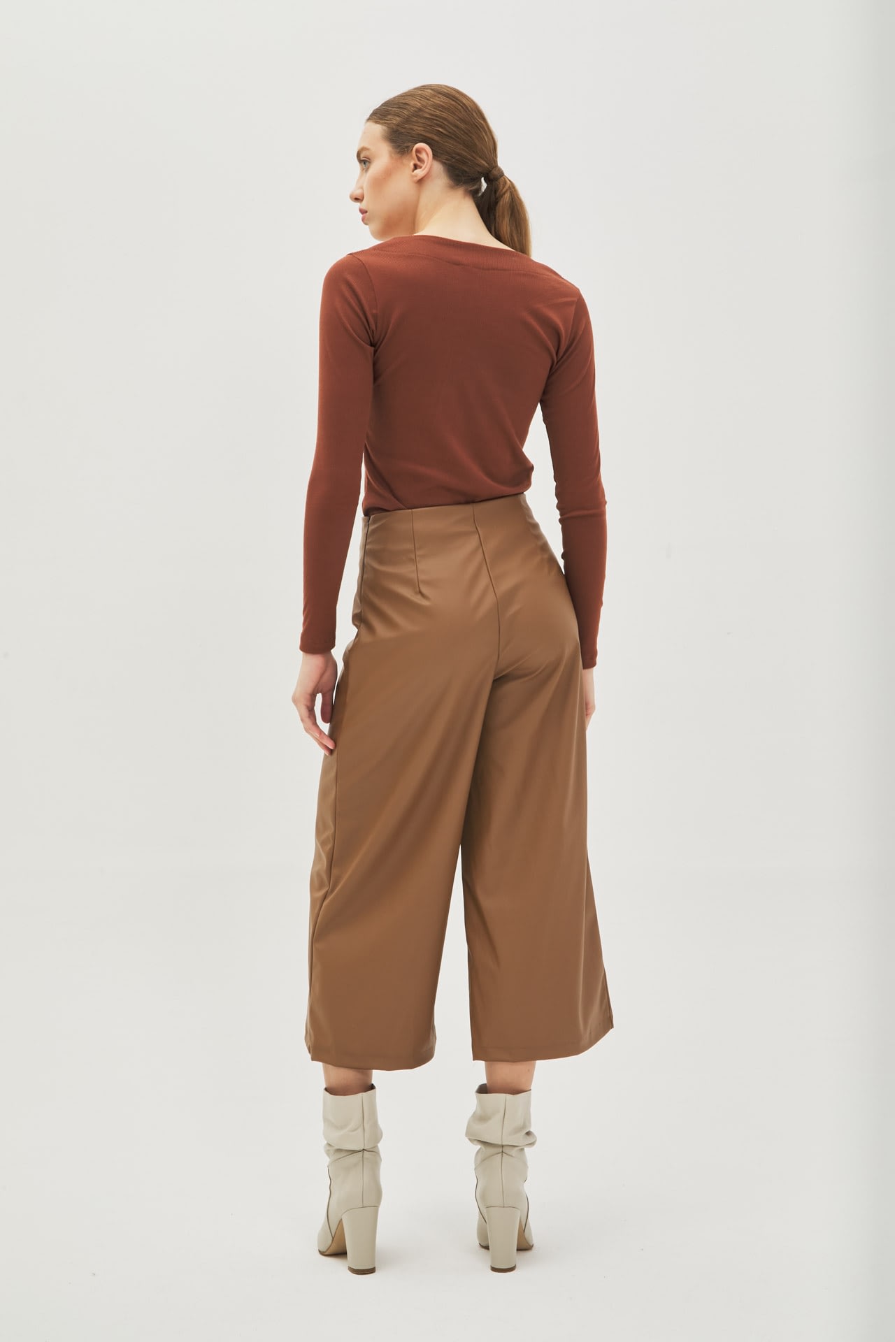 Pantalón culotte de eco cuero tiro alto, cierre invisible al costado.