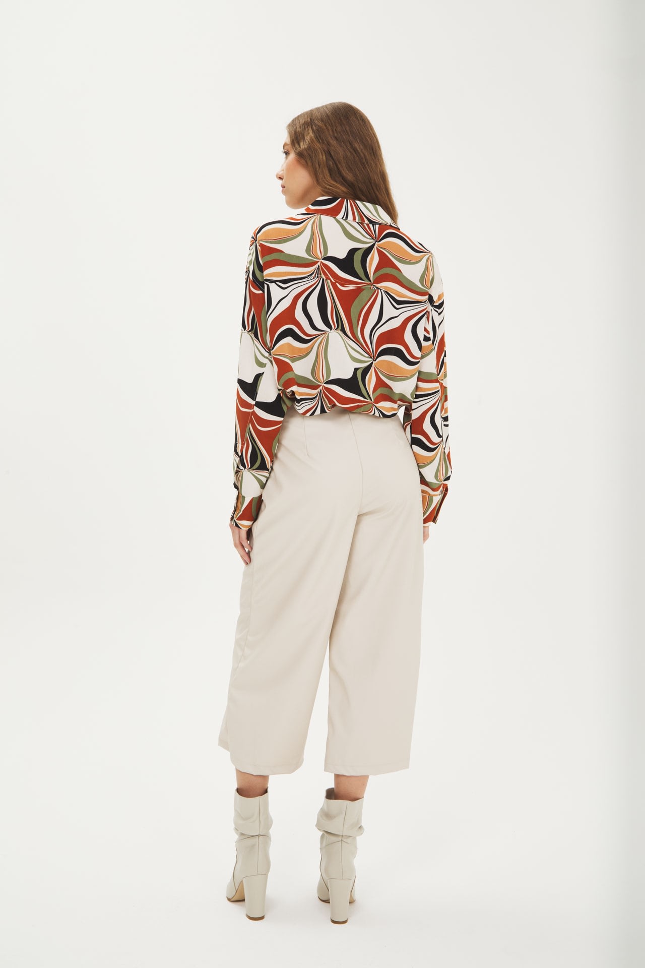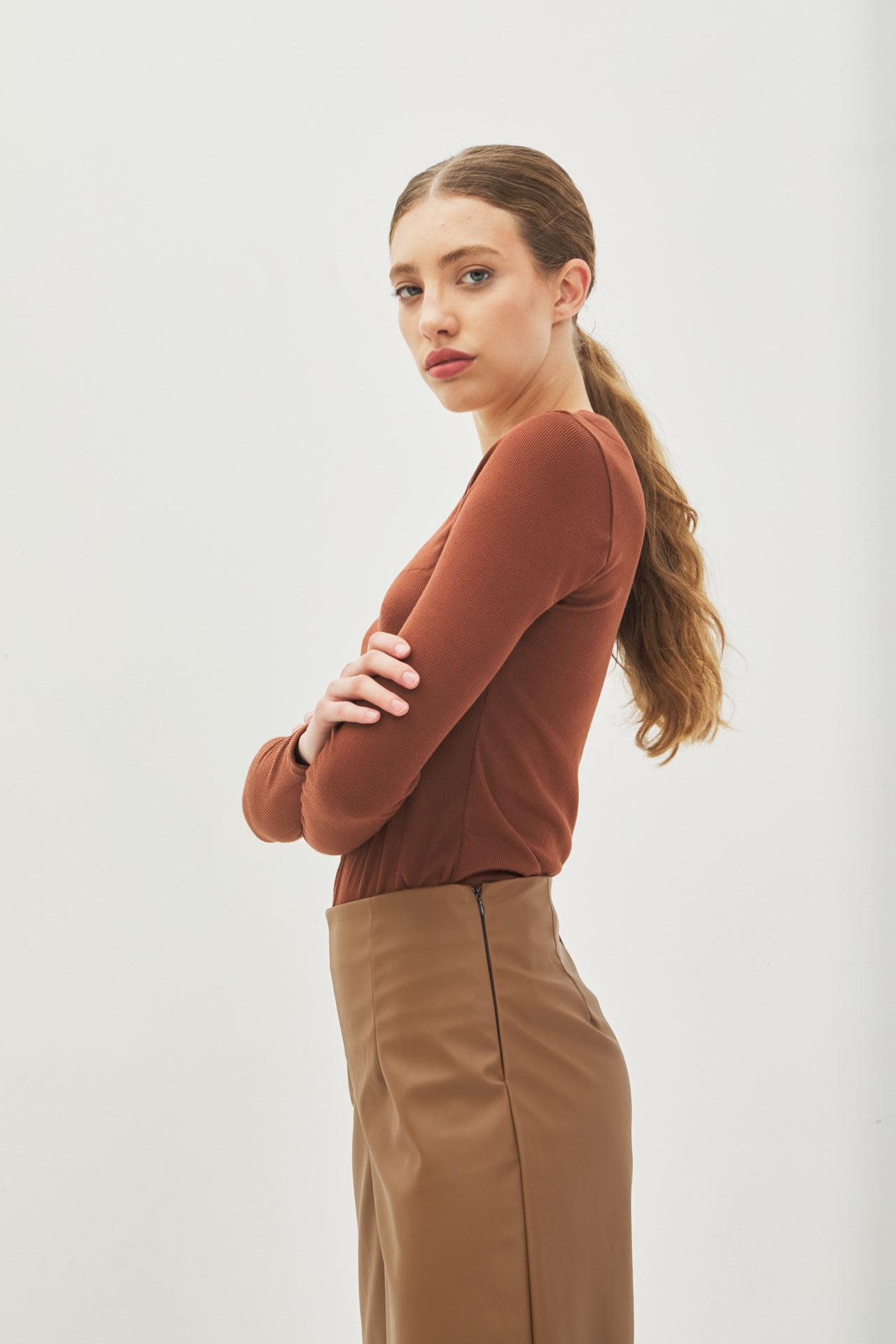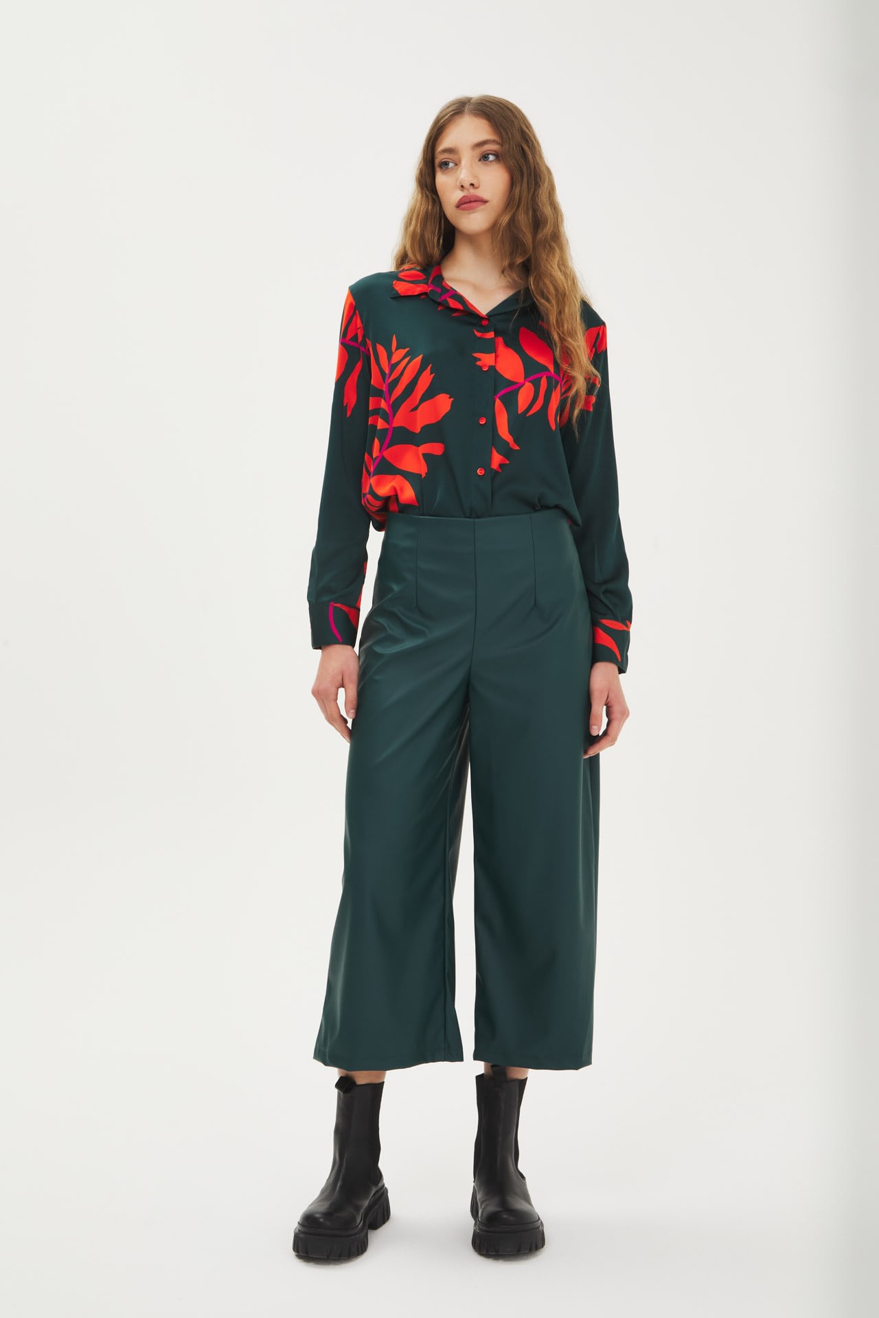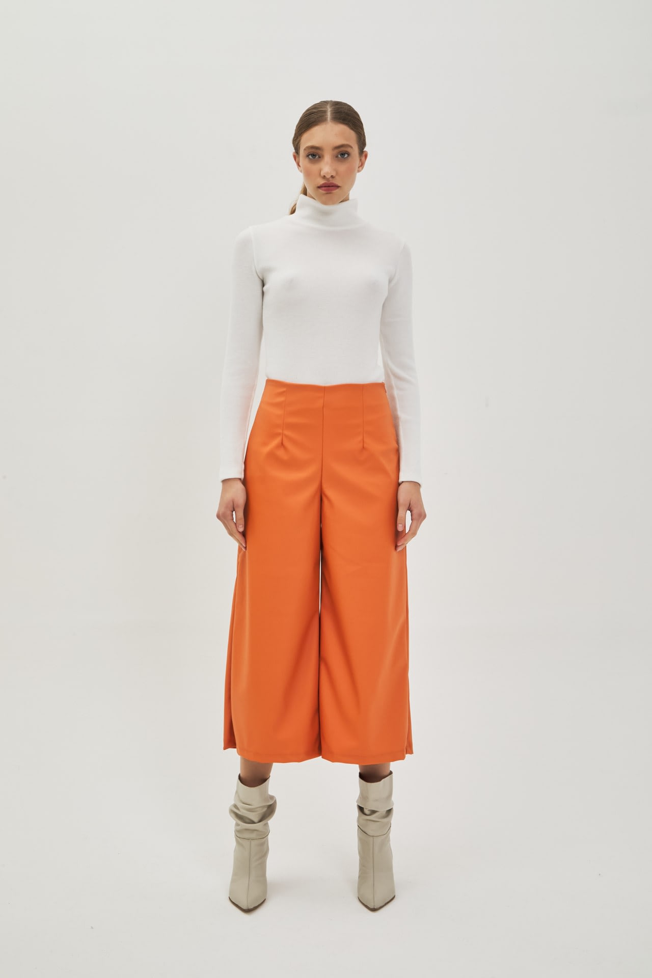 Pantalón culotte de eco cuero tiro alto, cierre invisible al costado.