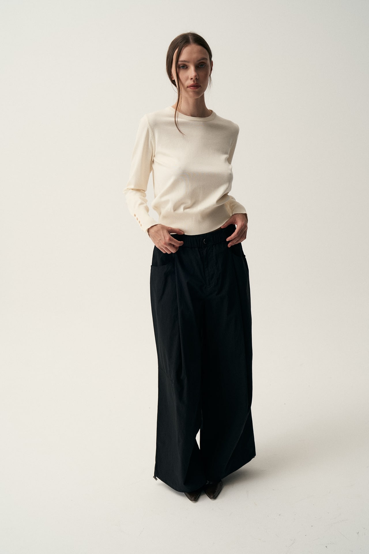 Pantalón parachute (65% algodón y 35% nylon) de tiro medio. Con elástico en cintura, cordón elástico con tanca regulable en puños. Bolsillos laterales reales. Cierre con botón en delantero. Detalle de costuras.