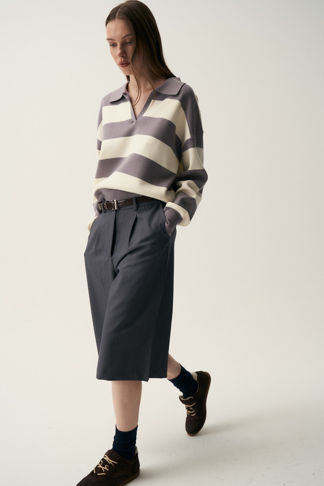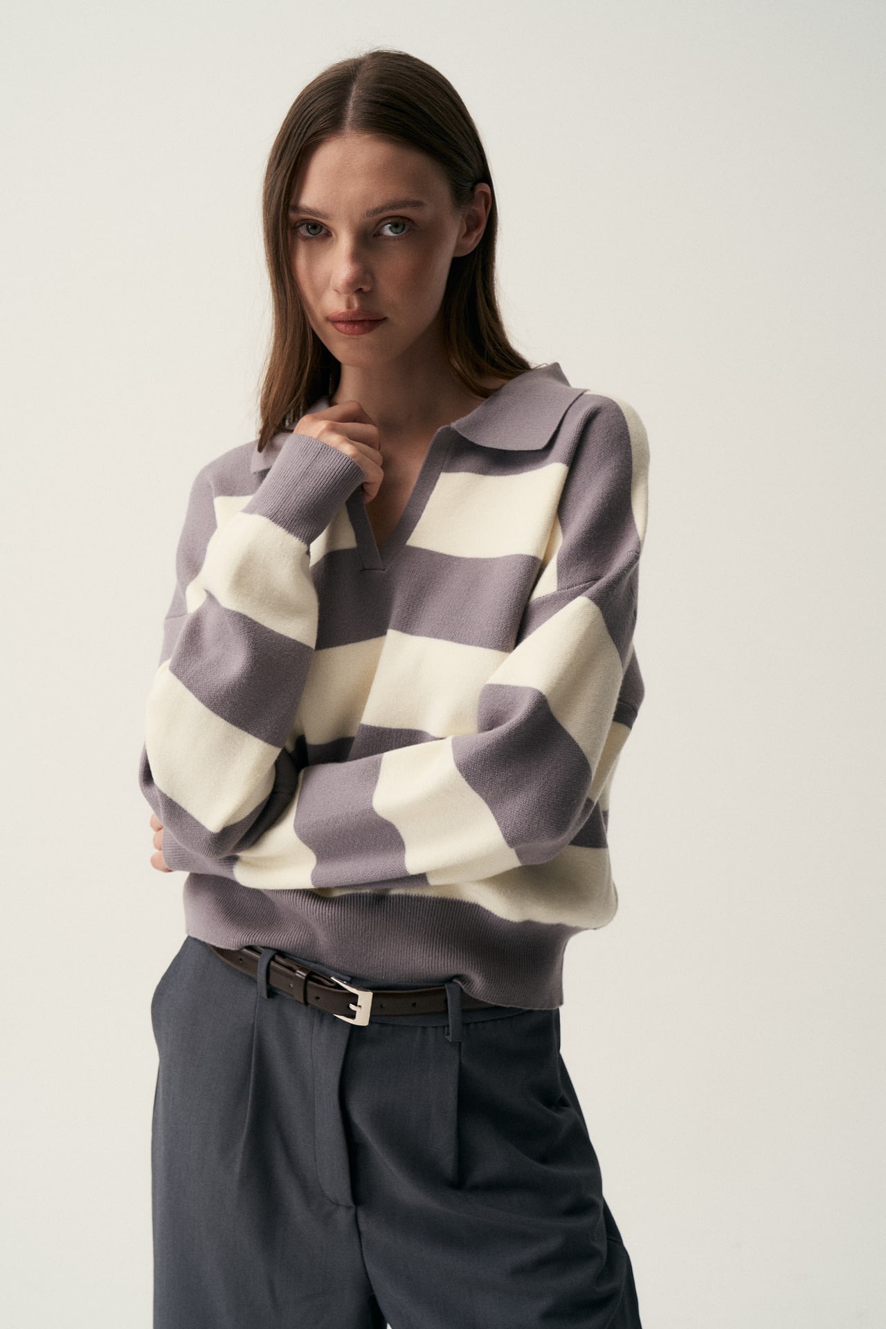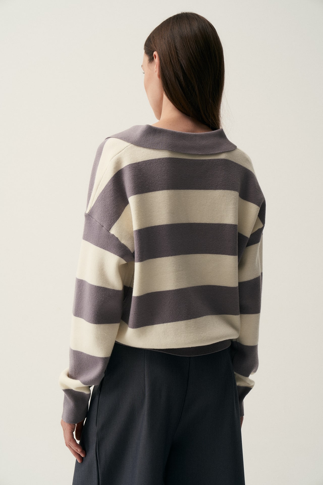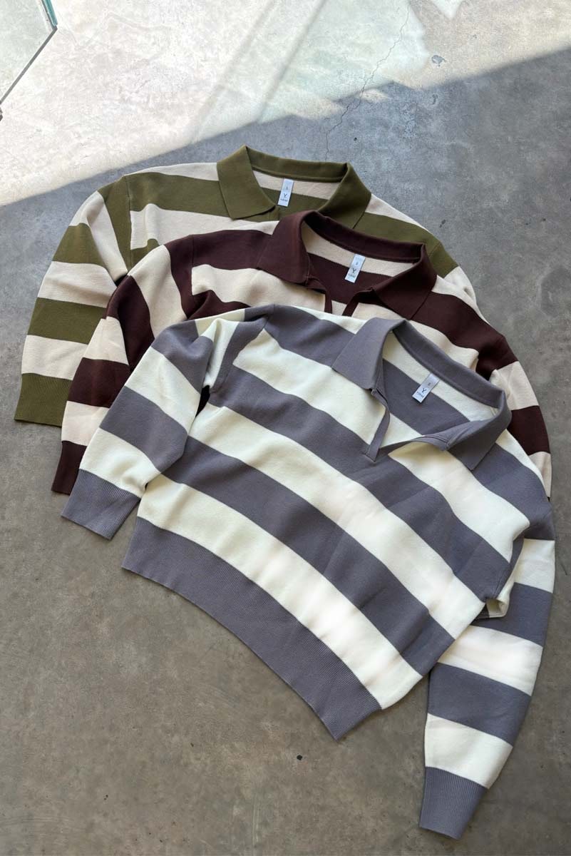 Sweater tejido (composicion 49.3% viscosa 27.7% nylon 23% pbt), cuello polo en V y patron a rayas horizontales. Fit oversize.