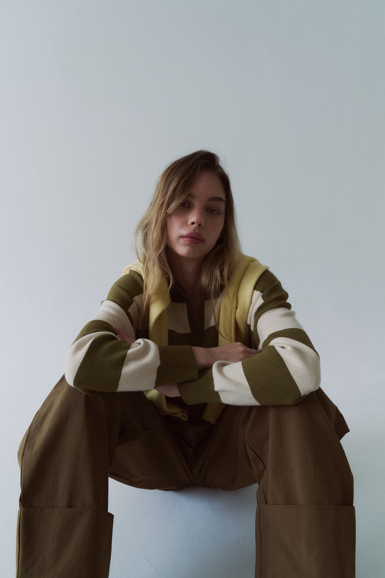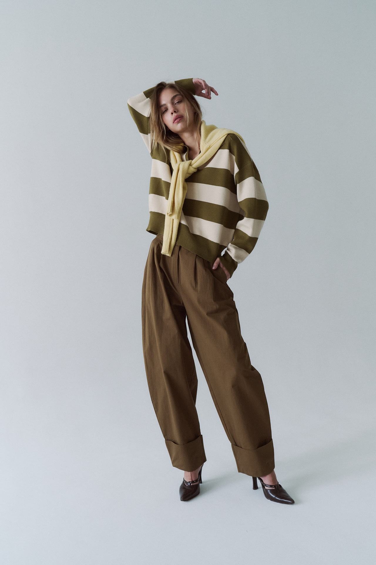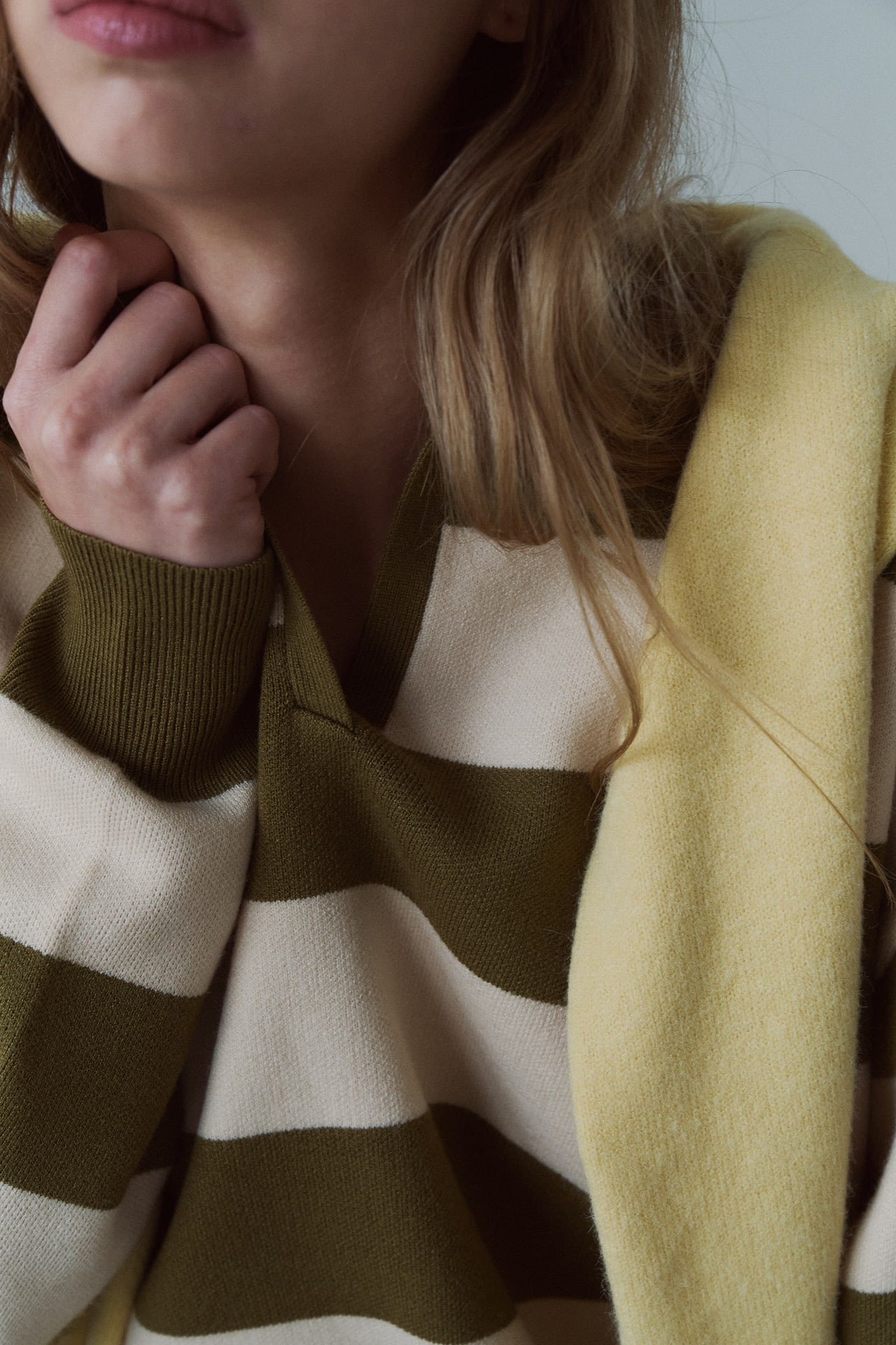 Sweater tejido (composicion 49.3% viscosa 27.7% nylon 23% pbt), cuello polo en V y patron a rayas horizontales. Fit oversize.